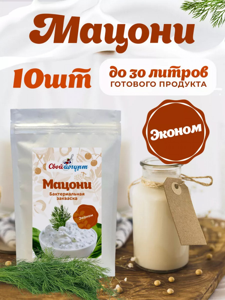 Закваска для мацони «Свой йогурт» это — здоровье и экономия, Вы получите до 30 литров домашнего мацони! Домашние продукты на заквасках — это отличный завтрак и перекус для всей семьи. Готовить его легко, в этом поможет подробная инструкция на упаковке. 1 стик может заквасить до 3 литров молока. Выбирайте полезное питание, стройную фигуру и здоровье для себя и ребенка. Попробовав один раз домашний мацони, вы больше не захотите покупать его в магазине.
