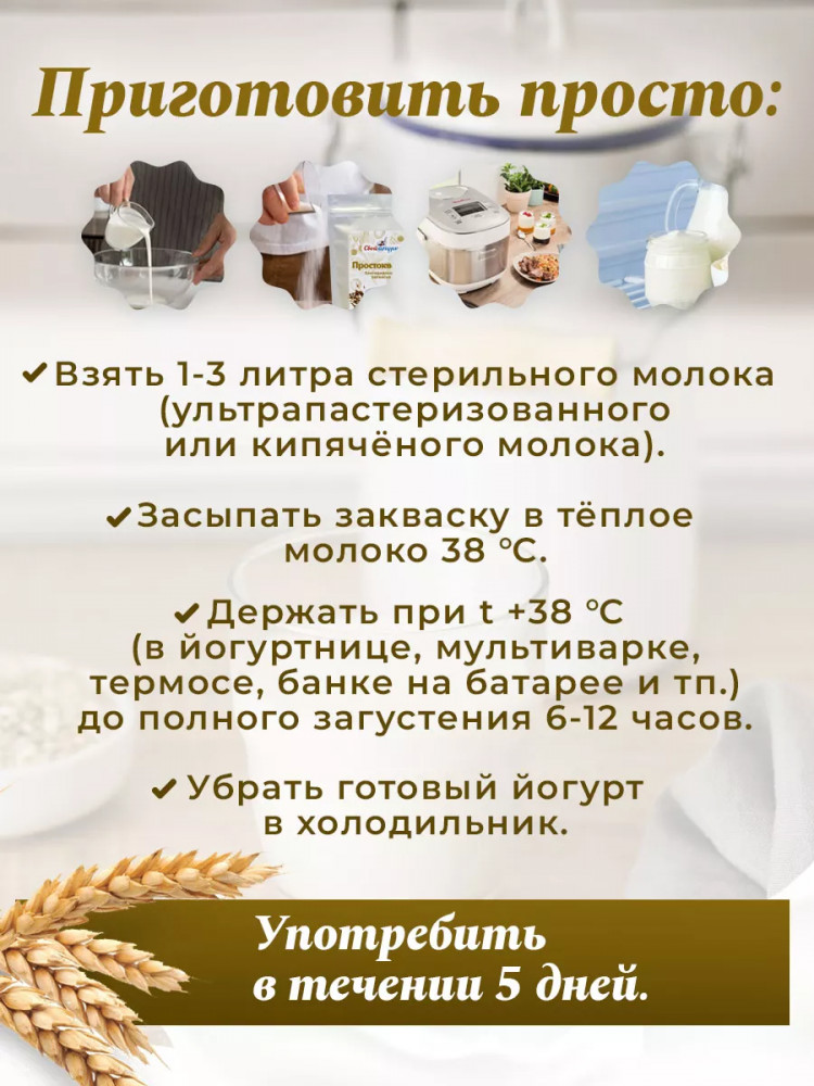 Закваска для простокваши «Свой йогурт» это — здоровье и экономия, Вы получите до 9 литров домашней простокваши! Домашние продукты на заквасках — это отличный завтрак и перекус для всей семьи. Готовить ее легко, в этом поможет подробная инструкция на упаковке. 1 стик может заквасить до 3 литров молока. Использовать нужно ультрапастеризованное молоко. Если вы готовите из домашнего, его нужно прокипятить, т. к. в молоке не должно присутствовать посторонней микрофлоры. Выбирайте полезное питание, стройную фигуру и здоровье для себя и ребенка. Попробовав один раз домашнюю простоквашу, вы больше не захотите покупать ее в магазине.
