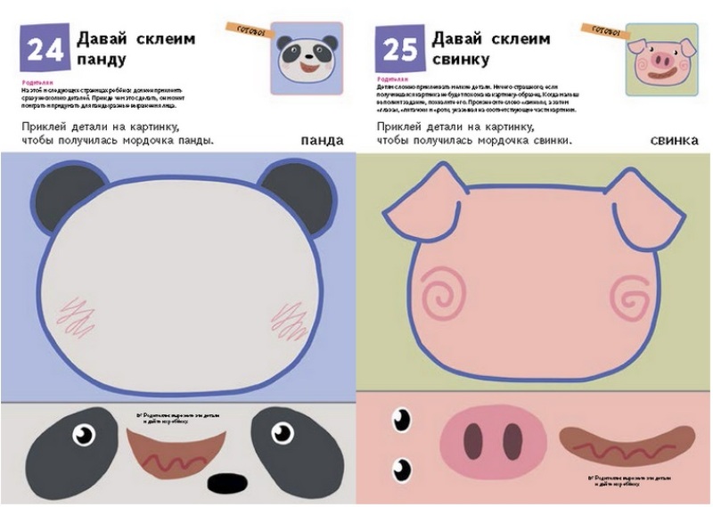 Очень хорошая тетрадка для развития мелкой моторики. Наклейки в книжке даны только для первых восьми заданий, в остальных заданиях нужно вырезать и приклеить картинку в определенное место. Постепенно задания усложняются. Думаю, что можно начинать заниматься по этой книжке даже немного раньше 2 лет.