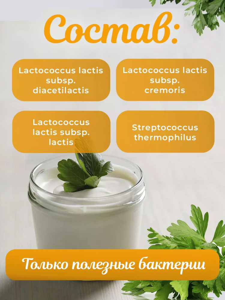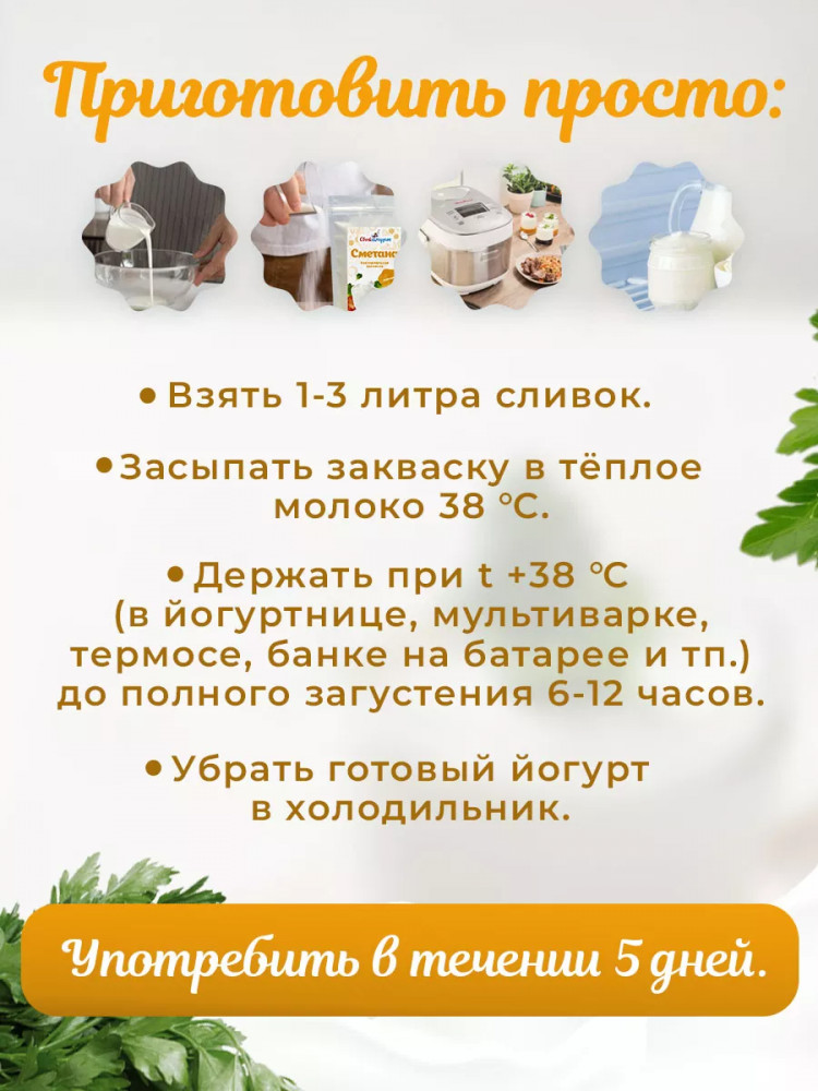 Закваска для сметаны «Свой йогурт» это — здоровье и экономия, Вы получите до 9 литров домашней сметаны! Готовить нужно на сливках, жирность вы контролируете сами. Но сметана получится и на жирном молоке (например 6 процентов). Готовить ее легко, в этом поможет подробная инструкция на упаковке. 1 стик может заквасить до 3 литров сливок или молока. Сметана на закваске будет отличной альтернативой покупной продукции, в том числе, соусы на сметане заменят майонез. А в сочетании с творогом на закваске вы получите здоровый и полезный завтрак для всей семьи. Закваску для творога, йогурта, ряженки и других домашних продуктов на заквасках, вы также можете приобрести в нашем магазине. Выбирайте полезное питание, стройную фигуру и здоровье для себя и ребенка. Попробовав один раз домашнюю сметану, вы больше не захотите покупать ее в магазине.