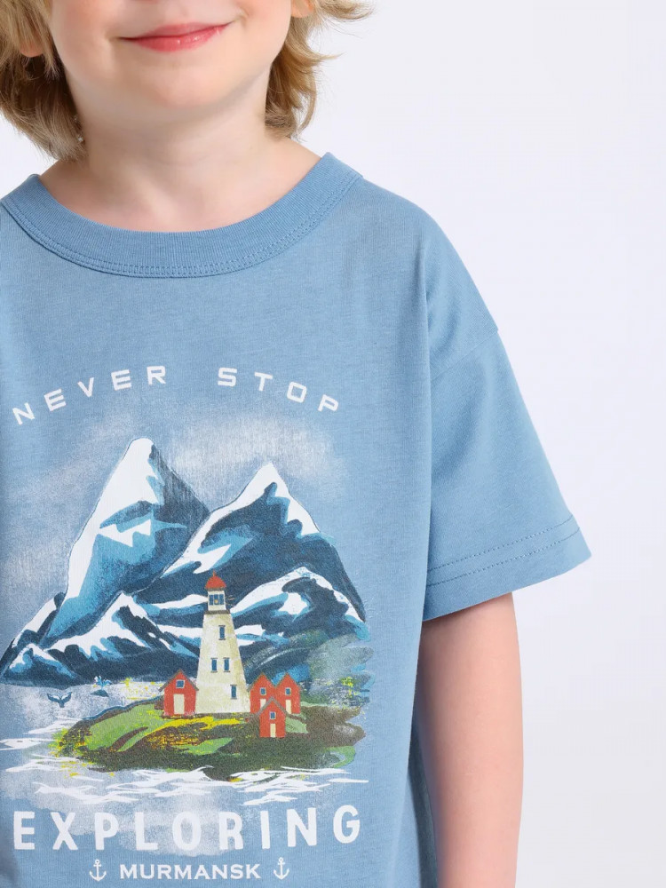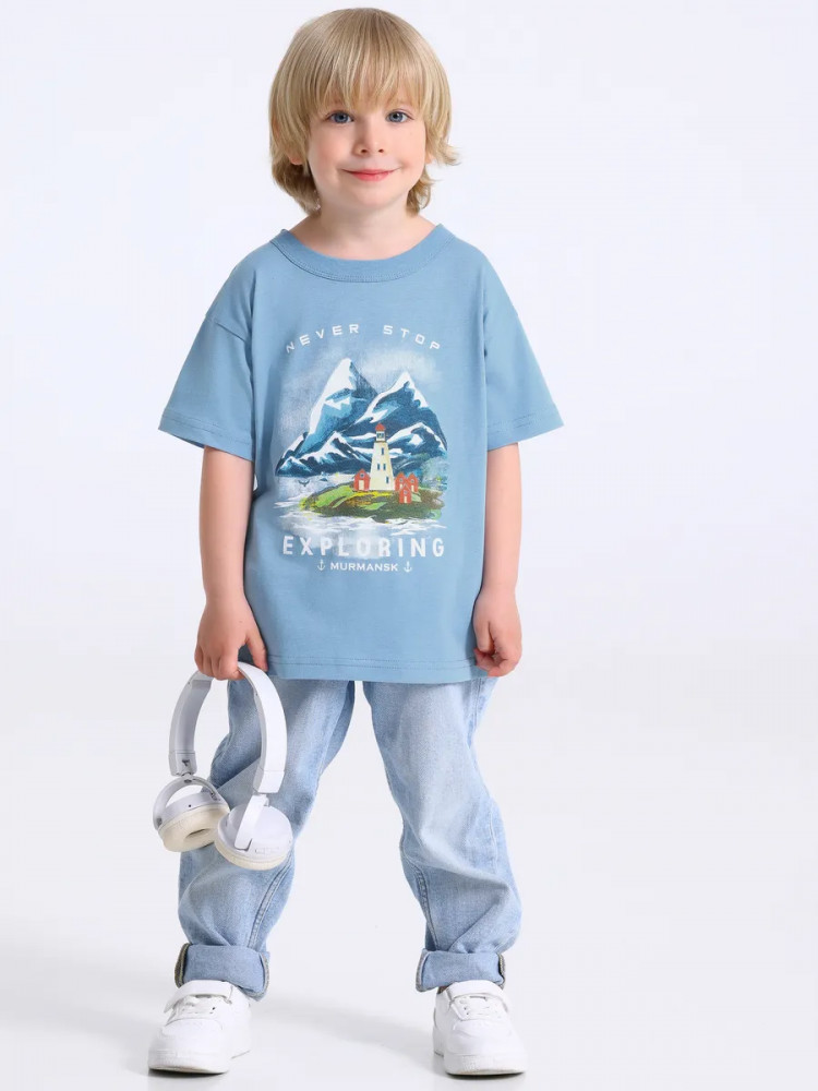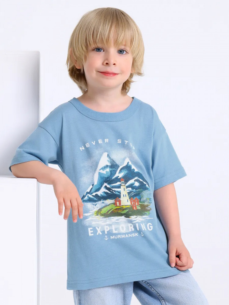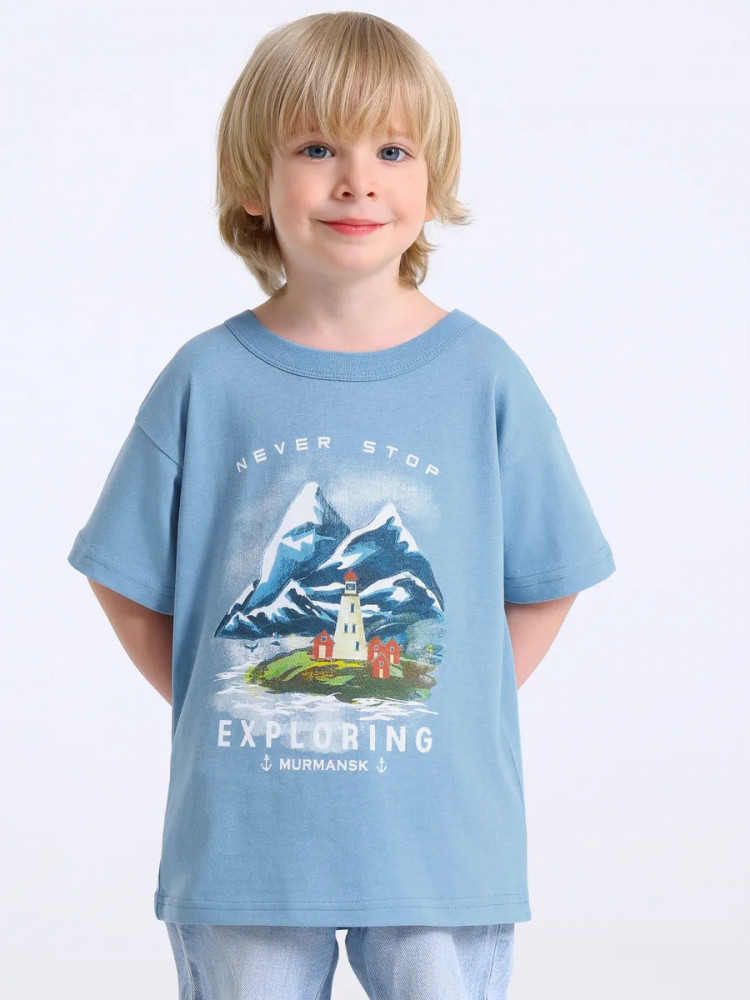 Футболка для мальчика из кулира — легкого хлопкового полотна. Изделие с короткими рукавами со спущенным плечом, украшено печатью.