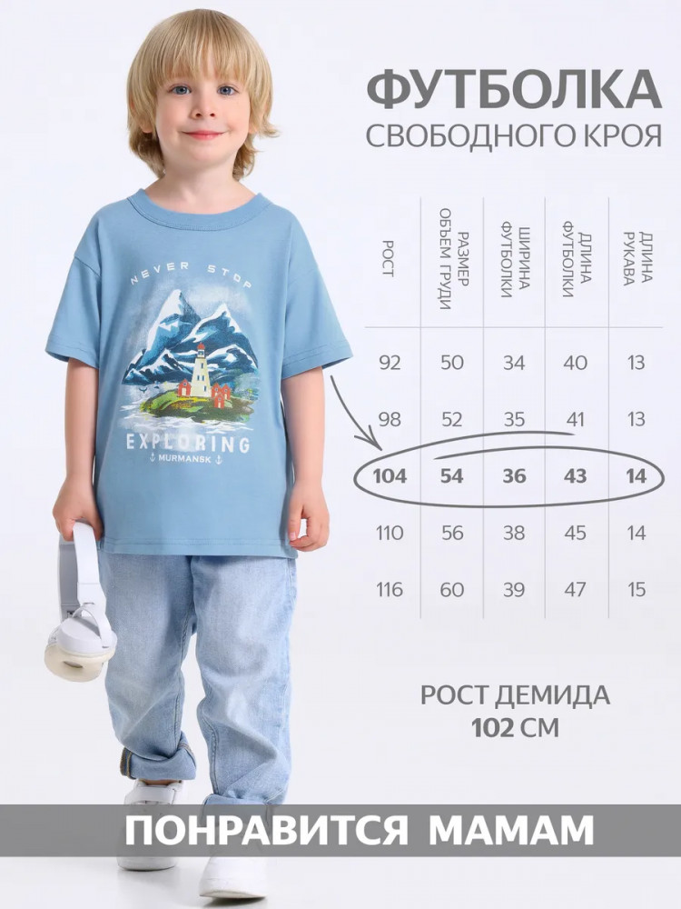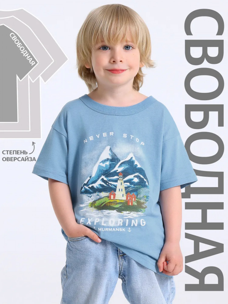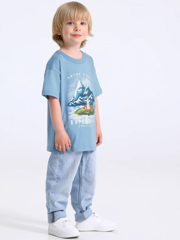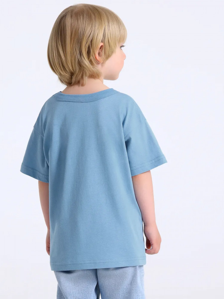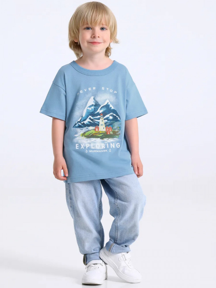 Футболка для мальчика из кулира — легкого хлопкового полотна. Изделие с короткими рукавами со спущенным плечом, украшено печатью.