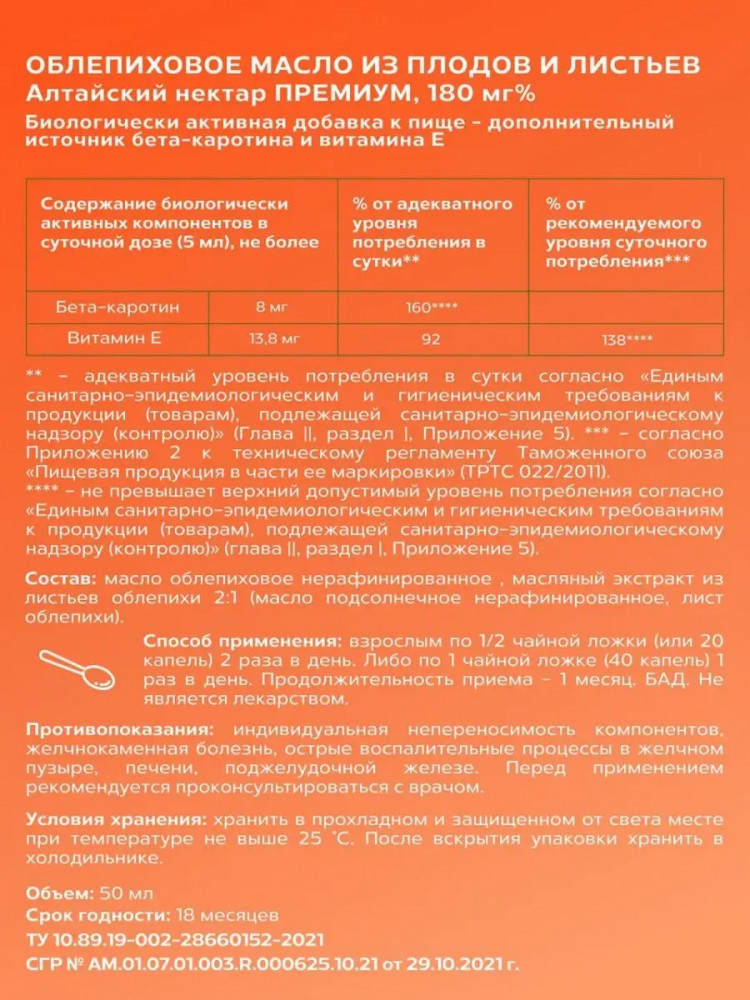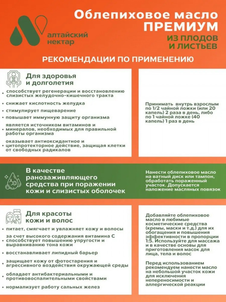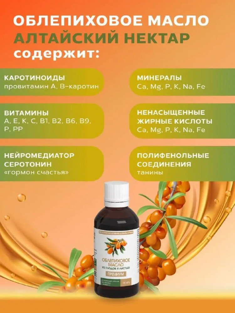Алтайский нектар Облепиховое масло из плодов и листьев «Премиум»В данный момент этот товар отсутствует в продаже. Возможно, у нас найдется аналогичный или похожий товар здесь. Облепиховое масло концентрованное из плодов и листьев — это натуральный продукт, который станет незаменимым помощником в поддержании здоровья и красоты! Изготовленное из отборных плодов и свежих листьев облепихи, это масло премиального качества является богатым источником бета-каротина, витаминов и микроэлементов. |