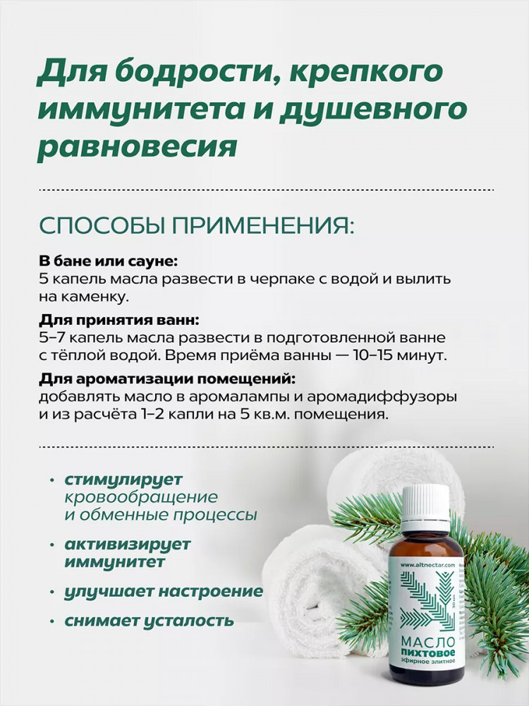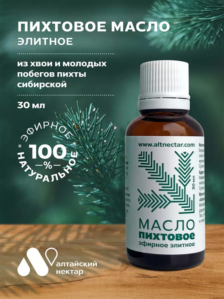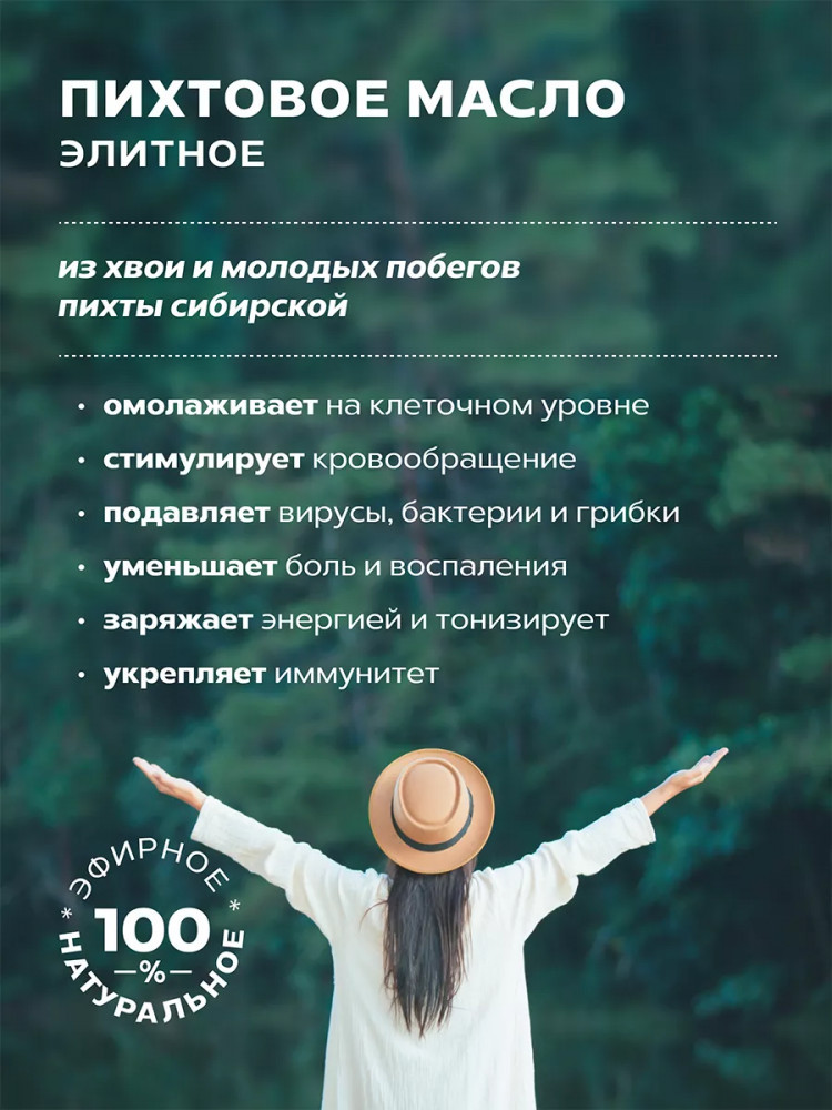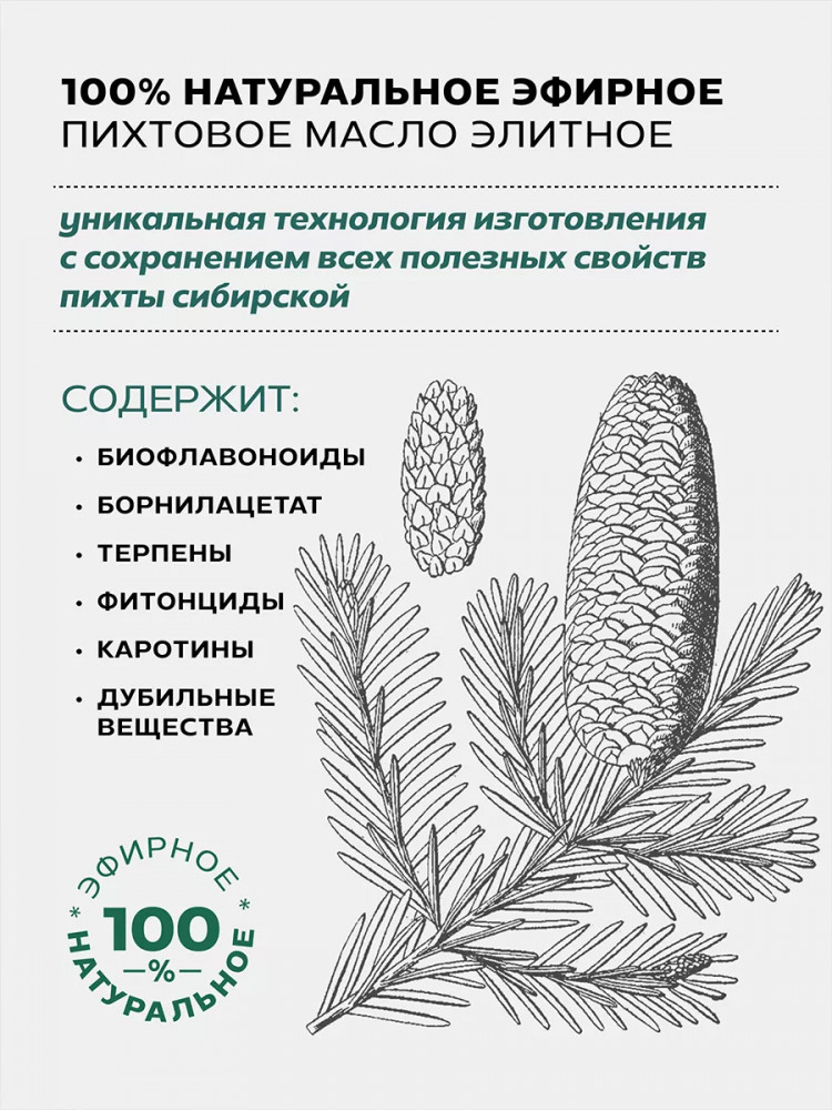Пихтовое масло «Элитное» — натуральное эфирное масло из хвои и молодых побегов пихты сибирской. Изготовлено по уникальной технологии, позволяющей максимально сохранить нативные полезные свойства живой хвойной субстанции. Пихтовое масло стимулирует иммунную систему, оказывает противовоспалительное, согревающее и обезболивающее действие, способствует регенерации и восстановлению тканей, проявляет высокую противовирусную и антибактериальную активность.