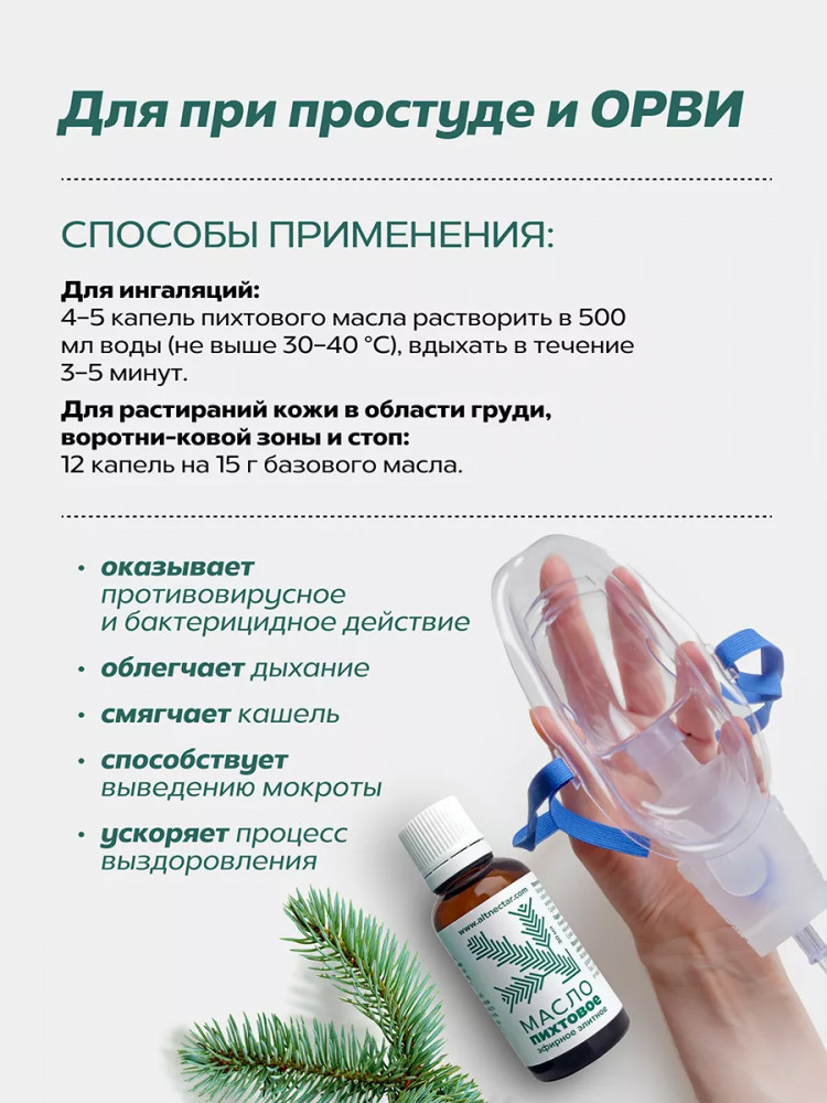 100% натуральное эфирное масло для бани, ванны и массажа. Можно использовать как масло для увлажнителя воздуха, детское масло для ингаляций от простуды и гриппа. Идеально для ароматерапии, гармонизирует и повышает настроение. Антиоксидант для омоложения организма. Пихтовое масло стимулирует иммунную систему, оказывает противовоспалительное, согревающее и обезболивающее действие, способствует регенерации и восстановлению тканей, проявляет высокую противовирусную и антибактериальную активность.
