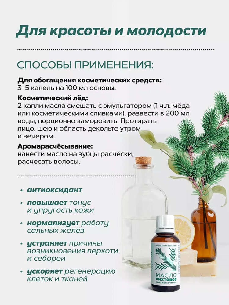 • для обогащения косметических средств (шампуней, кремов, ополаскивателей и тоников) — добавить пихтовое масло в любимое средство из расчёта 3–5 капель на 100 мл основы;