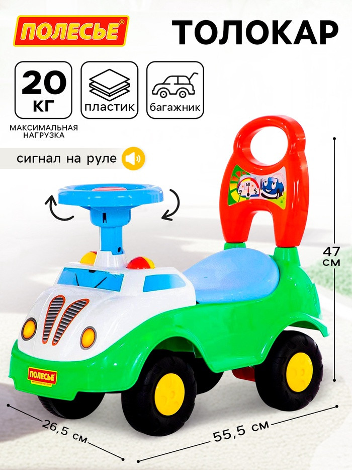 💳 Оплатить за товар можно при получении 🇰🇿 Есть бесплатная доставка по Казахстану от 1 дня 🎁 Копите бонусы с каждой покупки С яркой каталкой ребёнок научится ходить, потренирует координацию движений, вестибулярный аппарат и внимание. Малыш будет отталкиваться ножками — это поможет ему тренировать нужные группы мышц. Игрушка будет стимулировать ребёнка к активным действиям и поможет начать уверенно ходить. Яркая каталка подойдёт для игры на свежем воздухе или дома. Ручки расположены на удобной для малыша высоте. Спинка сиденья сделает поездку комфортной. Благодаря широким колёсам каталка устойчивая. Колёса поворачиваются с помощью руля. Под откидывающимся сиденьем находится вместительный багажник. На руле расположена пищалка-клаксон. Высота от пола до сиденья 20 см. Сиденье поднимается, можно использовать как багажник. Рекомендовано детям от 1 года. |