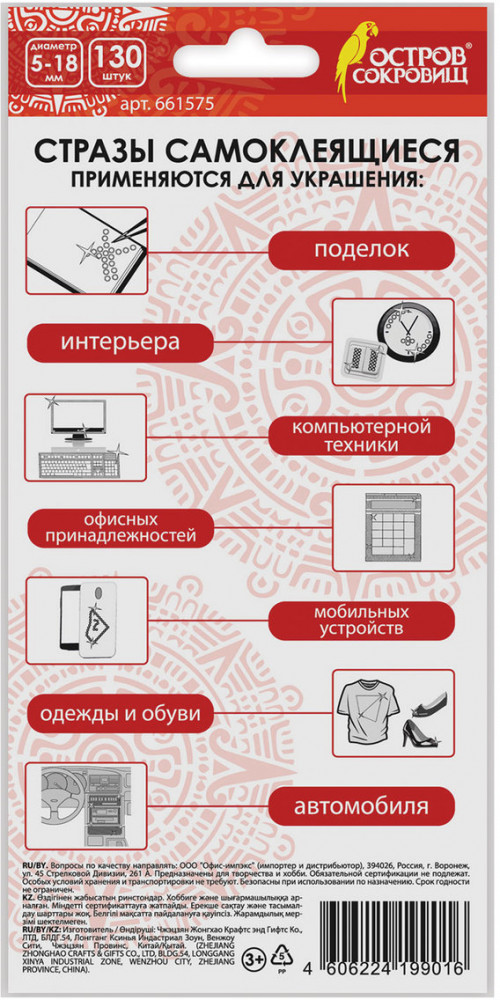 Остров сокровищ Стразы самоклеящиесяВ данный момент этот товар отсутствует в продаже. Возможно, у нас найдется аналогичный или похожий товар здесь. С помощью самоклеящихся страз Остров Сокровищ можно декорировать поделки и аппликации, детали интерьера, одежду и гаджеты, реализовать самые смелые творческие идеи. Качественный клеевой слой обеспечит надежную фиксацию на любых поверхностях. Легко отделяются от подложки. Изготовлены из пластика на основе акрила. Стразы представлены в трех размерах. Имеют форму сердечек и выполнены в завораживающих цветах. Предназначены для детей от 3 лет. Поставляются в пакете с европодвесом. В упаковке — 130 страз размером ассорти. Общий вес — 100 г. |
