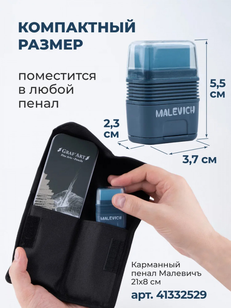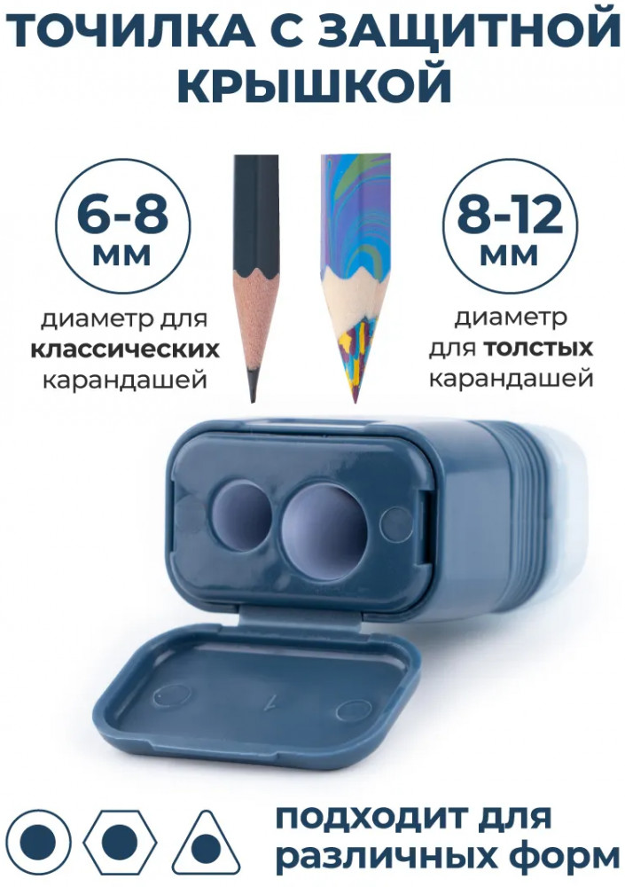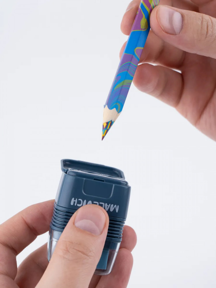💳 Оплатить за товар можно при получении 🇰🇿 Есть бесплатная доставка по Казахстану 🎁 Копите бонусы с каждой покупки Точилка и ластик в одном корпусе от «Малевичъ» — компактный вариант для школы, офиса, дома или для художников. Прекрасно подойдет тем, кто ценит качество, удобство и компактность. Мягкий ластик с одной стороны под отдельной крышкой и механическая точилка для карандашей с контейнером с другой стороны. Ручная точилка с ластиком рассчитана для карандашей стандартного диаметра, толстых, трехгранных и шестигранных. Одно отверстие диаметром 6-8 мм, второе — 9-12 мм. Острые лезвия позволяют быстро и без особых усилий заточить любой карандаш. Мягкий квадратный ластик отлично стирает графит, пастель, уголь, цветной карандаш с разной бумаги. Крышка надежно защищает стерку от загрязнений. Эргономичный корпус точилки-ластика «Малевич» выполнен из пластика. |