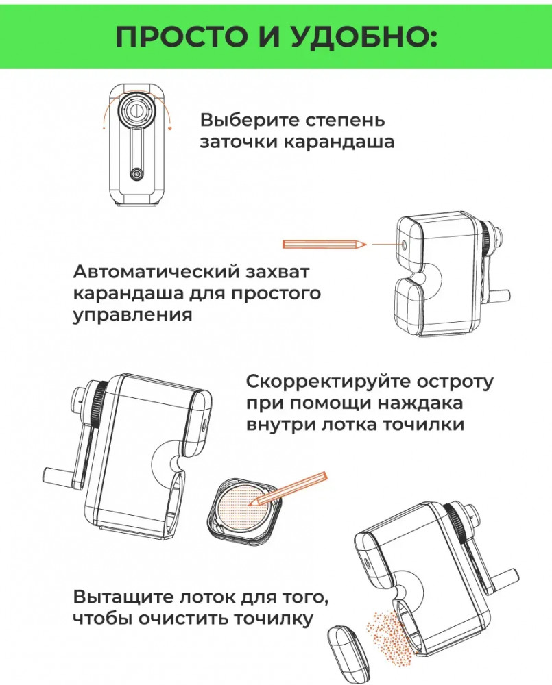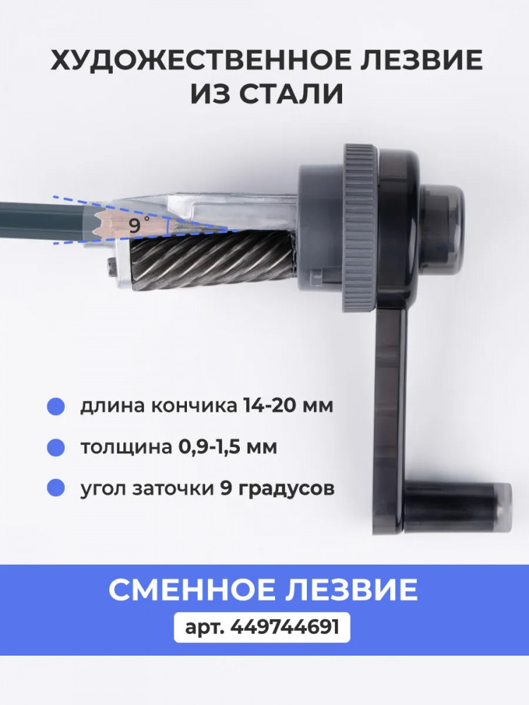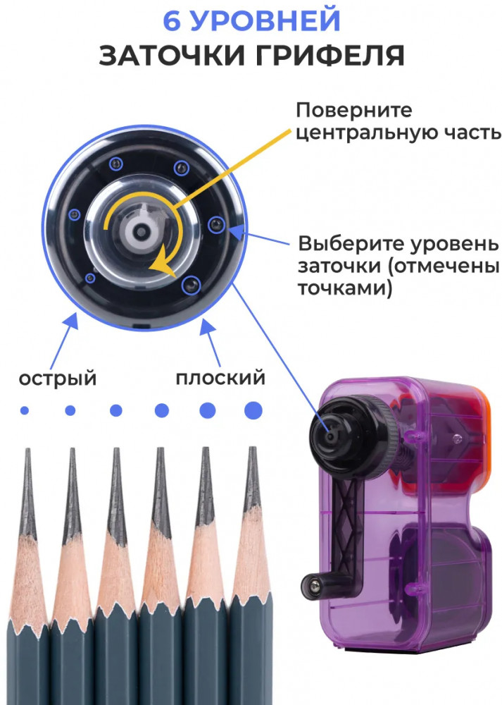 💳 Оплатить за товар можно при получении 🇰🇿 Есть бесплатная доставка по Казахстану от 1 дня 🎁 Копите бонусы с каждой покупки Механическая точилка для карандашей с контейнером «Малевичъ» в прозрачном корпусе. Точилка для карандашей ручная подходит для заточки карандашей диаметром до 8 мм, любой формы, любых граней. Точилка для художников устроена так, что можно отрегулировать толщину заточки карандаша и остроту грифеля. Прозрачный пластиковый корпус позволяет наблюдать и контролировать процесс заточки и наполняемость контейнера. Спиральные лезвия отличаются повышенной износостойкостью, не требуют заточку и смену долгие годы. Риск поломки грифеля практически равен нулю, что гарантировано высоким качеством сборки и точностью конструкции. Настольная точилка с ручкой снабжена вместительным контейнером для стружки. Точилка художественная подходит для шестигранных, трехгранных, простых, цветных и угольных карандашей. |