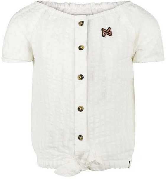 Мягкая и воздушная блузка молочного цвета выполнена из текстурной ткани с эффектом жатки. Модель украшена тремя пуговицами спереди и завязкой на поясе, что придаёт образу непринуждённый стиль. Акцент — декоративный шеврон на груди. Легкие джинсовые шорты с высокой посадкой дополняют образ, создавая комфортный и модный комплект для прогулок и игр на свежем воздухе.