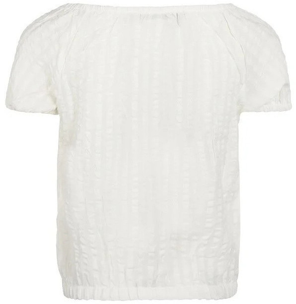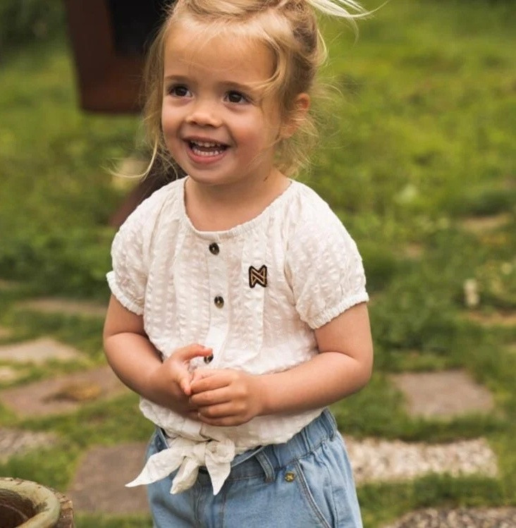 Мягкая и воздушная блузка молочного цвета выполнена из текстурной ткани с эффектом жатки. Модель украшена тремя пуговицами спереди и завязкой на поясе, что придаёт образу непринуждённый стиль. Акцент — декоративный шеврон на груди. Легкие джинсовые шорты с высокой посадкой дополняют образ, создавая комфортный и модный комплект для прогулок и игр на свежем воздухе.