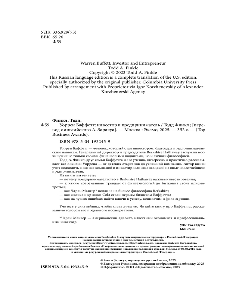 В данный момент этот товар отсутствует в продаже. Возможно, у нас найдется аналогичный или похожий товар здесь. Серия: Top Business Awards Уоррен Баффетт — человек, который стал инвестором, благодаря предпринимательским навыкам. Генеральный директор и председатель Berkshire Hathaway заслужил восхищение не только своими финансовыми подвигами, но и личной философией. Тодд А. Финкл, друг семьи Баффетта и его ученик, интересно и практично рассказывает все о жизни Уоррена — от детских стартапов до успешной компании. Автор книги учит подходить к оценке компаний и инвестированию с оглядкой на опыт известнейшего предпринимателя. Учитесь у сильнейших, чтобы стать лучшим. Читайте книгу про Баффетта, рассказанную голосом его преданного последователя.