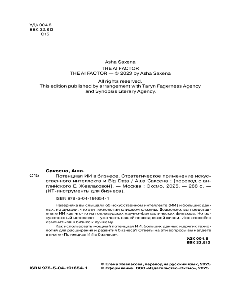 💳 Оплатить за товар можно при получении 🇰🇿 Есть бесплатная доставка по Казахстану от 1 дня 🎁 Копите бонусы с каждой покупки Серия: ИТ-инструменты для бизнеса Искусственный интеллект, большие данные, облачные технологии, робототехника и умные устройства. «Потенциал ИИ в бизнесе» — отличный источник знаний для тех, кто хочет разобраться в основах искусственного интеллекта и понять, как его можно применять в реальной жизни. Книга детально рассказывает о том, что такое искусственный интеллект, какие существуют подходы к его созданию. Вы узнаете, как понимать большие данные и грамотно использовать их для развития бизнеса, используя уникальную методологию. Это поможет выбрать оптимальный подход для задач и оценить возможности, которые предоставляет искусственный интеллект в нужной сфере деятельности. Используйте этот мощный потенциал для развития, свободно работайте с данными и внедряйте инновации. |