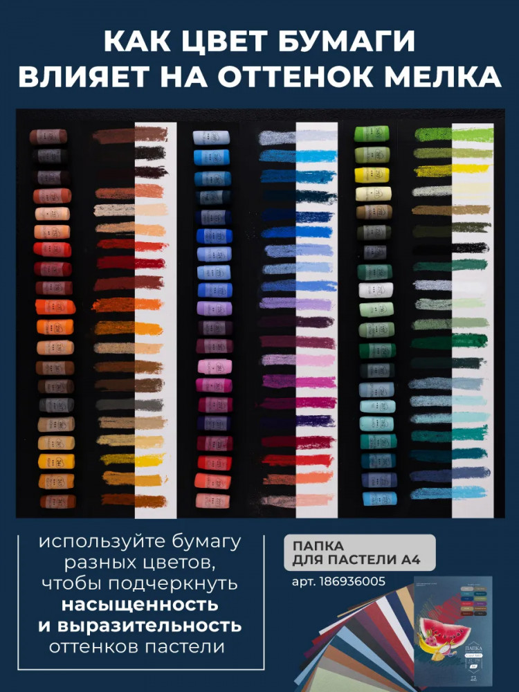 Пастель «Малевичъ» ручной работы, поэтому размер мелков может немного отличаться. Пастельные мелки для рисования имеют круглое сечение, упакованы в прочную картонную коробку, внутри поролон с нишей. На каждом мелке указана степень светостойкости. Для работы рекомендуем использовать готовую тонированную пастельную бумагу или затонировать самостоятельно акварелью или гуашью. Тонировка позволяет не покрывать цветом всю поверхность, что дает возможность экономить цвет и придавать работе непринужденную воздушность, легкость и глубину.