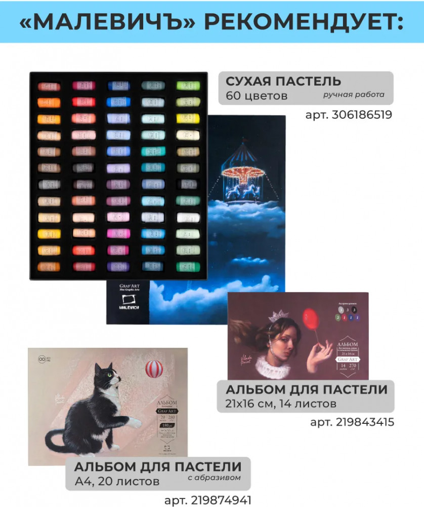 Сухая мягкая пастель «Малевичъ» GrafArt Pro ручной работы разработана совместно с профессиональной художницей Vlada Paint. Название цветов выбирали пользователи нашей продукции! Авторская цветовая палитра хорошо сбалансирована и разделена пополам на теплые и холодные оттенки. Это идеальный инструмент как для опытных художников, так и для начинающих мастеров. Мягкая текстура позволяет легко наносить цвет на бумагу, добиваясь насыщенных и ярких оттенков. Каждый мелок пастели изготовлен с использованием высококачественных пигментов, что обеспечивает максимальную стойкость и долговечность цвета.