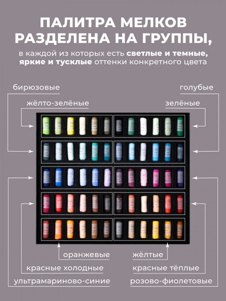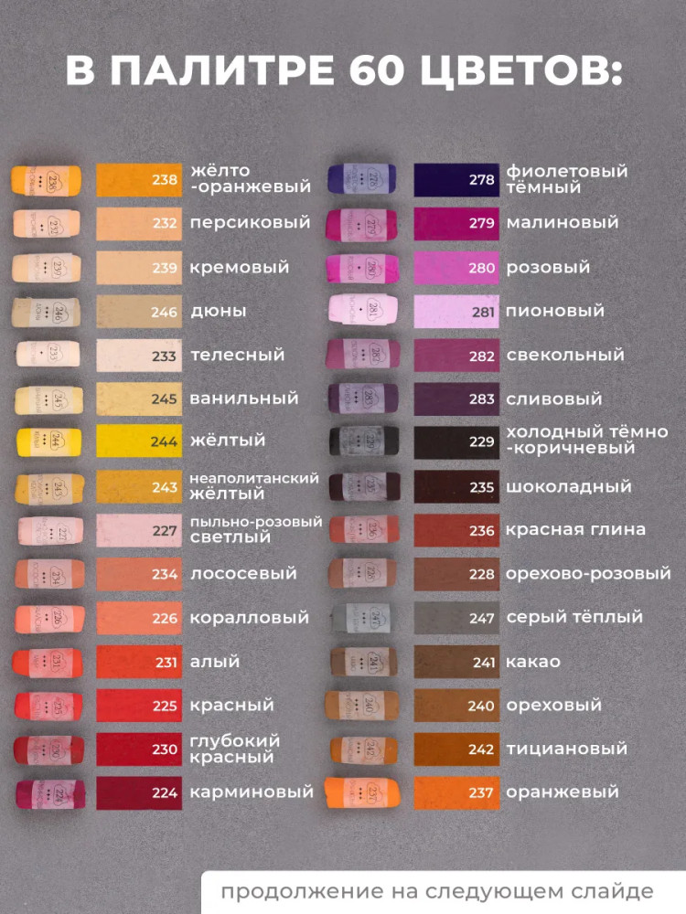 💳 Оплатить за товар можно при получении 🇰🇿 Есть бесплатная доставка по Казахстану от 1 дня 🎁 Копите бонусы с каждой покупки Серия: GrafArt Pro Профессиональная сухая пастель «Малевичъ» GrafArt Pro. На рубашках мелков вся необходимая информация: номер цвета, название и показатель светостойкости. Брусочки мелков круглого сечения (~1.7×3.8 см.) легко и мягко наносятся на пастельную бумагу и хорошо держат сцепление. Переход от тона к тону происходит плавно, позволяя создать сложные по колориту работы. Цвета прекрасно смешиваются между собой, способствуя эффекту бархатной поверхности. Пастель изготавливается вручную, что позволяет контролировать высокое качество и баланс чистого пигмента мелкого помола с натуральным связующим. Набор из 60 оттенков собран таким образом, что позволяет закрыть большинство творческих идей в любых сюжетах. |