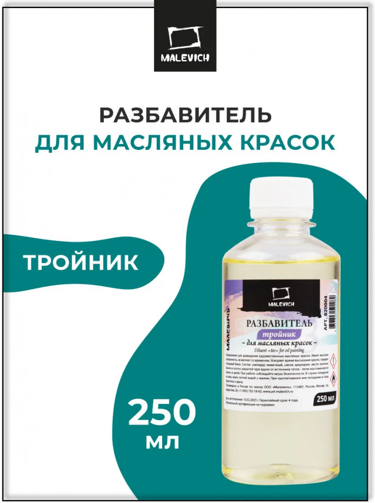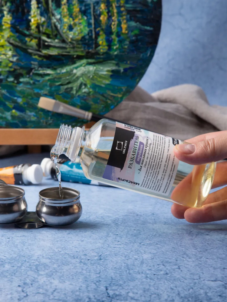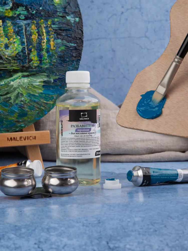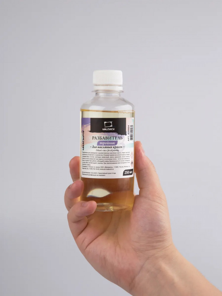 Разбавитель тройник на основе живичного скипидара, смолы араукарии, льняного масла используется для разведения художественных масляных красок. Расфасован в удобную экономичную упаковку с безопасной крышкой объемом 250 мл. Разбавитель «Малевич» имеет высокую прозрачность, не желтеет со временем, ускоряет высыхание живописного слоя и придает глянцевый блеск.