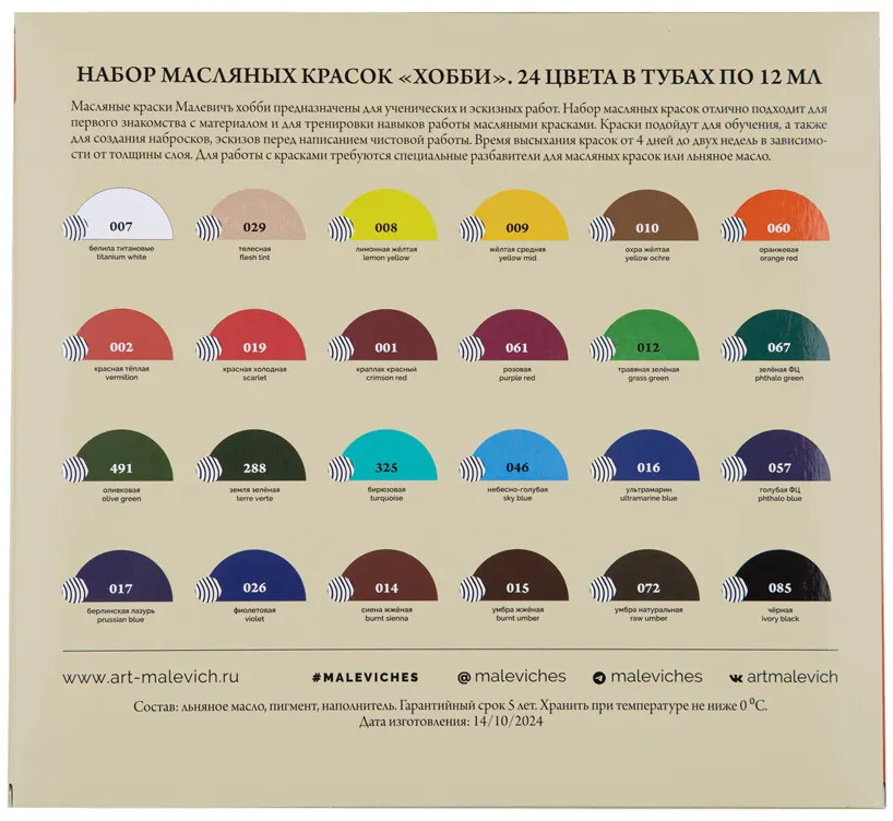 💳 Оплатить за товар можно при получении 🇰🇿 Есть бесплатная доставка по Казахстану от 1 дня 🎁 Копите бонусы с каждой покупки Серия: Hobby Набор масляных красок «Hobby» для простых декоративных работ, детского творчества и начинающих знакомство с материалами. Краски подойдут для обучения, а также для создания набросков, эскизов перед написанием чистовой работы. Масло «Малевич» хорошо смешивается между собой – это дает возможность получить еще больше оттенков. Краски позволяют отработать любые техники рисования. Время высыхания красок на холсте от 4 дней до двух недель в зависимости от толщины слоя. Для работы с масляными красками требуются специальные разбавители или льняное масло. После работы рекомендуется очищать инструменты сразу. |