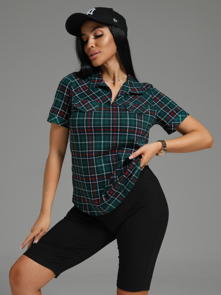 Футболка женская в клетку, с коротким рукавом, на полочке имитация карманов. Низ округлой формы с перепадом длины. Футболка является неотъемлемой частью женского гардероба. Вы будете великолепны в представленной модели, стильная и модная футболка обязана быть в гардеробе каждой дамы.