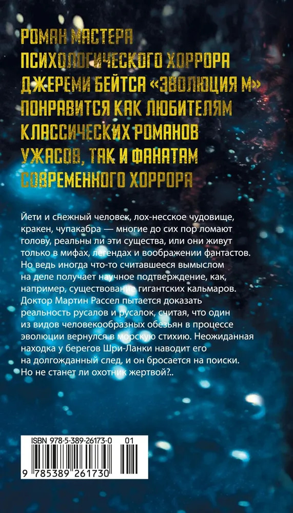 💳 Оплатить за товар можно при получении 🇰🇿 Есть бесплатная доставка по Казахстану от 1 дня 🎁 Копите бонусы с каждой покупки Серия: Новые звезды хоррора «Эволюция М» Джереми Бейтса — это захватывающий фантастический хоррор, погружающий в пучину океанских тайн и древних ужасов. Биолог доктор Рассел пытается научно доказать существование русалок, но реальность оказывается далека от сказочных образов. Вместо прекрасных созданий он обнаруживает смертельно опасных древних хищников. Если вы любите атмосферу «Бездны» Джеймса Кэмерона, напряженность «Чужих» и мистику «Пиратов Карибского моря», то этот роман — для вас. «Эволюция М» — это путешествие в мир, где граница между мифом и реальностью стирается, а каждый шаг может стать последним. Погрузитесь в тайны океана вместе с Джереми Бейтсом. Готовы ли вы узнать, что скрывается в его глубинах? |