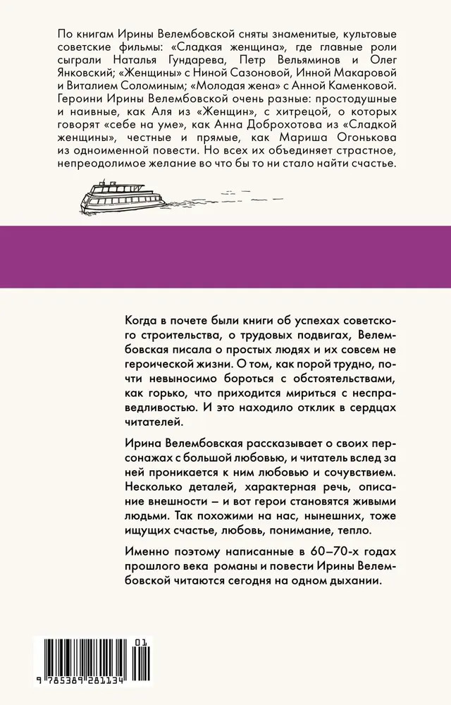 💳 Оплатить за товар можно при получении 🇰🇿 Есть бесплатная доставка по Казахстану от 1 дня 🎁 Копите бонусы с каждой покупки Серия: Как мы жили. Лучшее в советской прозе По романам Ирины Велембовской сняты знаменитые, культовые советские фильмы: «Сладкая женщина», где главные роли сыграли Наталья Гундарева, Петр Вельяминов и Олег Янковский; «Женщины» с Ниной Сазоновой, Инной Макаровой и Виталием Соломиным; «Молодая жена» с Анной Каменковой. Героини Ирины Велембовской очень разные: простодушные и наивные, как Аля из «Женщин», с хитрецой, о которых говорят «себе на уме», как Анна Доброхотова из «Сладкой женщины», честные и прямые, как Мариша Огонькова из одноименной повести. Но всех их объединяет страстное, непреодолимое желание во что бы то ни стало найти счастье. |
