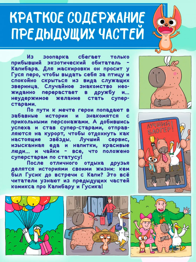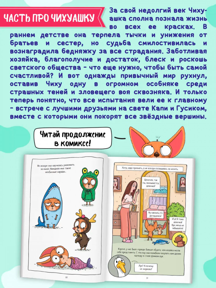💳 Оплатить за товар можно при получении 🇰🇿 Есть бесплатная доставка по Казахстану от 1 дня 🎁 Копите бонусы с каждой покупки Серия: Капибара и Гусь За свой недолгий век Чихуашка сполна познала жизнь во всех ее красках. В раннем детстве она терпела тычки и унижения от братьев и сестер, но судьба смилостивилась и вознаградила бедняжку за все страдания. Заботливая хозяйка, благополучие и достаток, блеск и роскошь светского общества — что еще нужно, чтобы быть самой счастливой? И вот однажды привычный мир рухнул, оставив Чиху одну в огромном особняке среди страшных теней и зловещего воя сквозняка. И только теперь понятно, что все испытания вели ее к главному — встрече с лучшими друзьями на свете Капи и Гусиком, вместе с которыми они покорят все звездные вершины. |