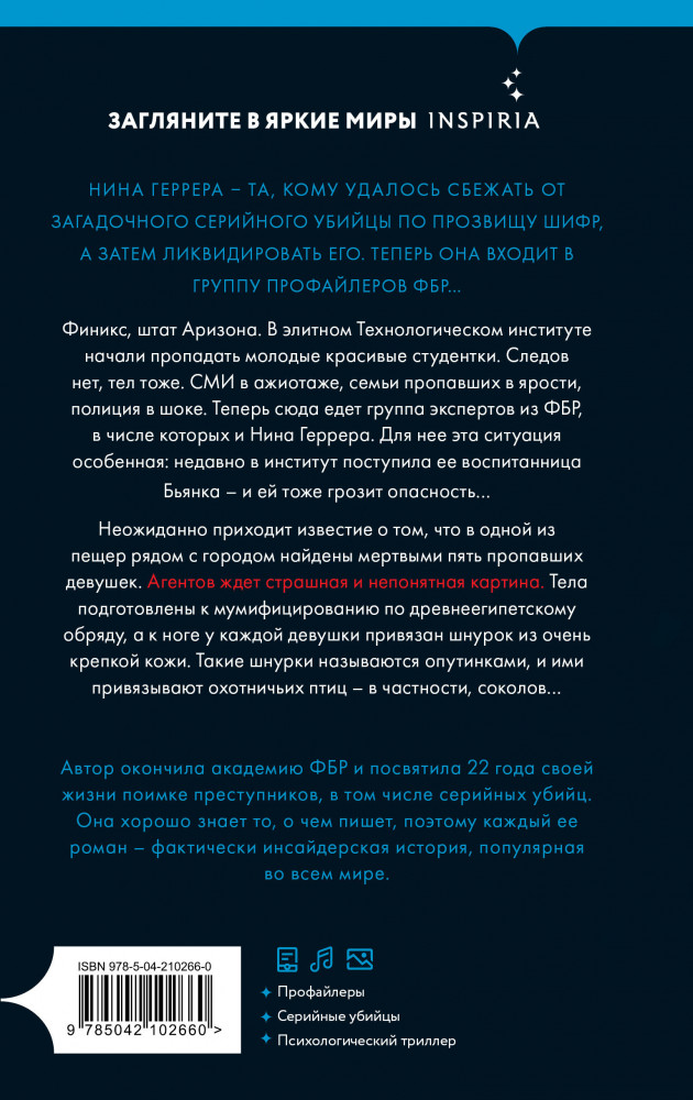 💳 Оплатить за товар можно при получении 🇰🇿 Есть бесплатная доставка по Казахстану от 1 дня 🎁 Копите бонусы с каждой покупки Серия: Tok. Внутри убийцы. Триллеры о психологах-профайлерах Ее, как и дикую птицу, можно приручить. Но для этого обеих нужно поймать — и подавить... Нина Геррера — та, кому удалось сбежать от загадочного серийного убийцы по прозвищу Шифр, а затем ликвидировать его. Теперь она входит в группу профайлеров ФБР... Финикс, штат Аризона. В элитном Технологическом институте начали пропадать молодые красивые студентки. Следов нет, тел тоже. СМИ в ажиотаже, семьи пропавших в ярости, полиция в шоке. Теперь сюда едет группа экспертов из ФБР, в числе которых и Нина Геррера. Для нее эта ситуация особенная: недавно в институт поступила ее воспитанница Бьянка — и ей тоже грозит опасность... |