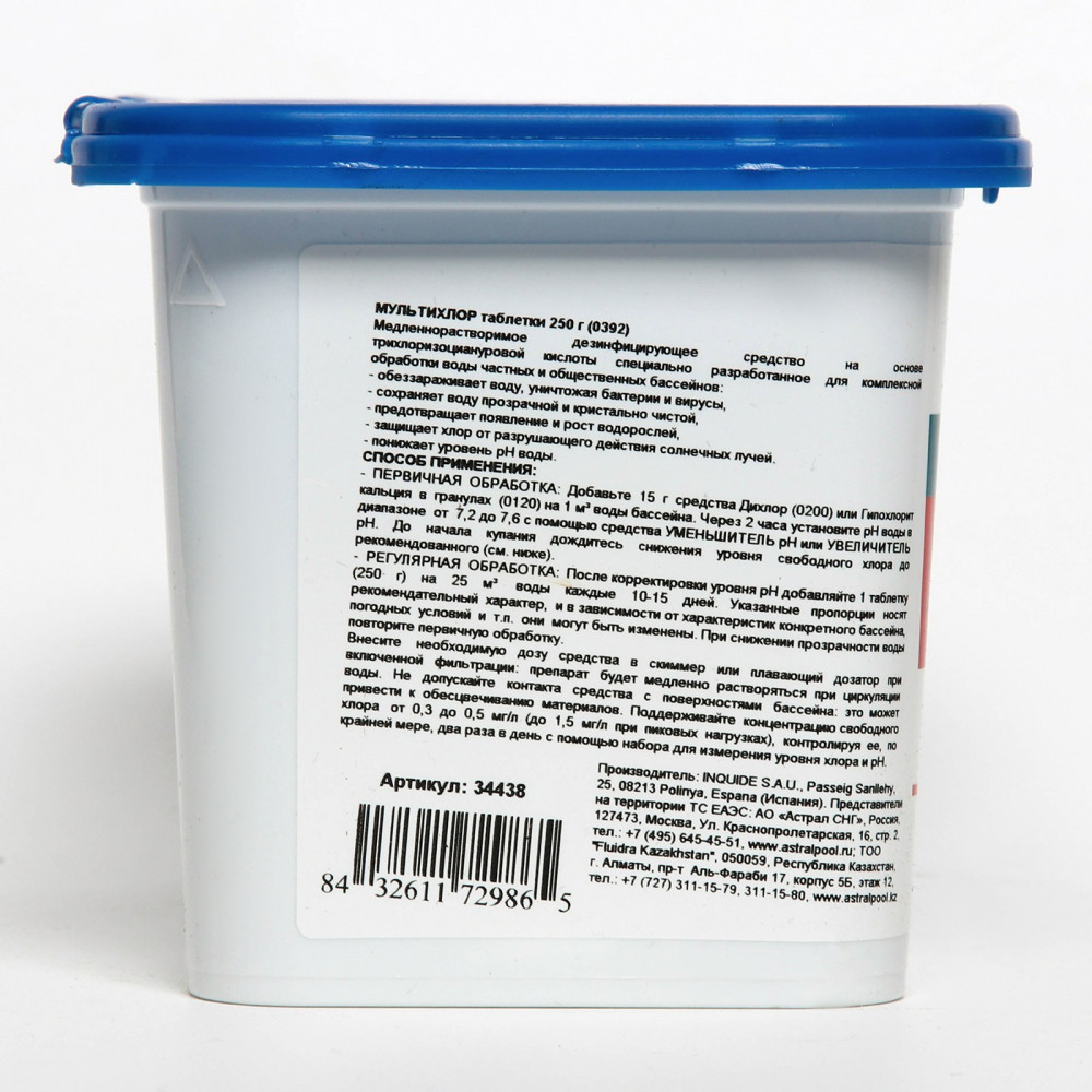 Astralpool Мультихлор для дезинфекции воды и предотвращения появления водорослей и мутности в бассейнахВ данный момент этот товар отсутствует в продаже. Возможно, у нас найдется аналогичный или похожий товар здесь. Медленно растворимые многофункциональные таблетки на основе стабилизированного хлора, в состав которых входят так же альгицид и флокулянт: не только обеспечивают эффективную дезинфекцию, но и предотвращают появление водорослей и мутности, обеспечивая кристальную чистоту воды. |