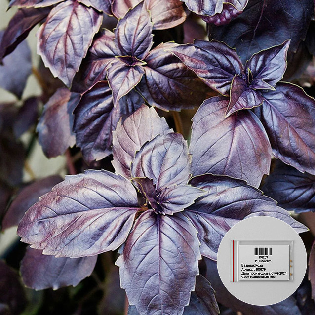 Базилик фиолетовый «Рози» — среднеспелый пряно-вкусовой сорт с насыщенным перечным ароматом. Растение прямостоячее, средней высоты (до 40 см), с фиолетовыми эллиптическими листьями и тёмно-фиолетовыми цветками. От полных всходов до начала сбора проходит около 38 дней. Масса одного растения достигает 210 г, урожайность зелени — до 2,2 кг/м². Базилик «Рози» отлично подходит для использования в свежем и сушёном виде, как натуральный ароматизатор и добавка к блюдам в кулинарии и консервировании. |