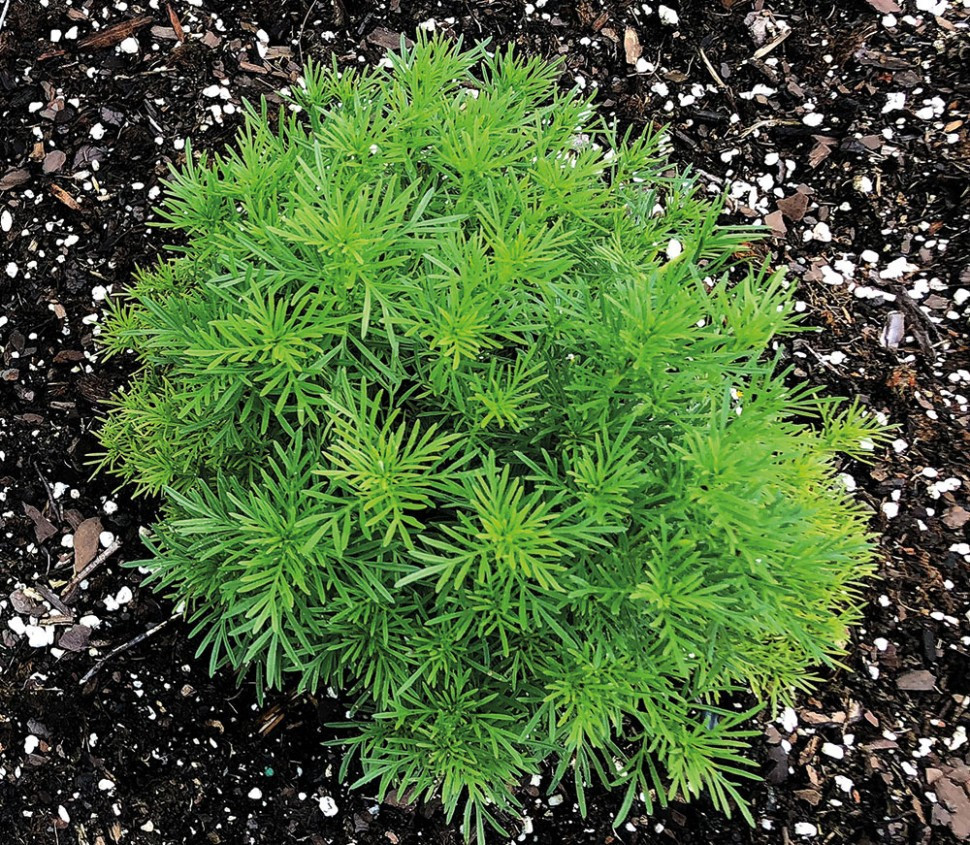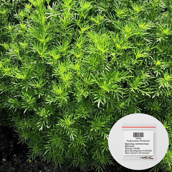 Бархатцы нитевидные «Дропшот» (Tagetes filifolia Dropshot) — однолетнее съедобное растение высотой около 30 см, отличающееся тонкими разветвлёнными побегами и ажурной мелкой листвой. Куст густо покрыт немахровыми соцветиями, создавая эффект компактной шаровидной клумбы. Листва обладает сладким вкусом с ярким ароматом солодки и аниса, может использоваться как пряная добавка и замена эстрагона. Наилучший рост наблюдается при длинном световом дне — при сокращении светового времени начинается цветение, после чего растение отмирает. Бархатцы «Дропшот» отлично подходят для посадки в смешанных контейнерах с зеленью и цветами. |