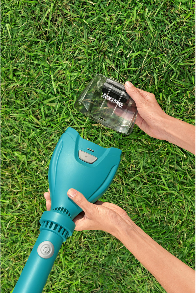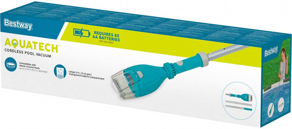 Вакуумный очиститель на батарейках Bestway совместим со всеми надувными джакузи и бассейнами диаметром до 305 см. Благодаря беспроводной технологии AquaTech обеспечивает эффективную очистку бассейна. Пылесос включается нажатием одной кнопки. Эксплуатация беспроводного пылесоса не требует особых усилий — необходимо всего 8 батареек типа АА (не входят в комплект поставки). Трехкомпонентная ручка позволяет регулировать зону охвата, чтобы добраться до любого уголка бассейна. Ее можно комбинировать с другими чистящими инструментами и насадками (Ø 30 мм, не входят в комплект). Прозрачный контейнер для грязи AquaTech позволяет отслеживать уровень заполнения, вы всегда будете точно знать, когда нужно очистить контейнер.