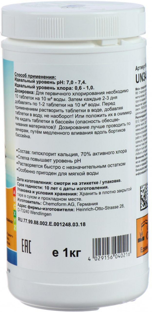 Применение: для проведения качественной первичной обработки необходимо 4-5 таблеток растворить на 10м3 воды. Для более продолжительного хлорирования понадобится 2-3 таблетки применять каждые 3-6 дней. Дозировку удобно осуществлять при помощи плавающей капсулы или скиммера. Не желательно кидать таблетки прямо целыми в бассейн, чтобы не появилась опасность обесцвечивания материалов. Удобнее всего проводить обработку в вечерние часы после корректировки показания уровня РН. Стремиться к показанию рН на уровне 7.0-7.4, а уровень хлора при этом должен составлять 0.6-1.0.