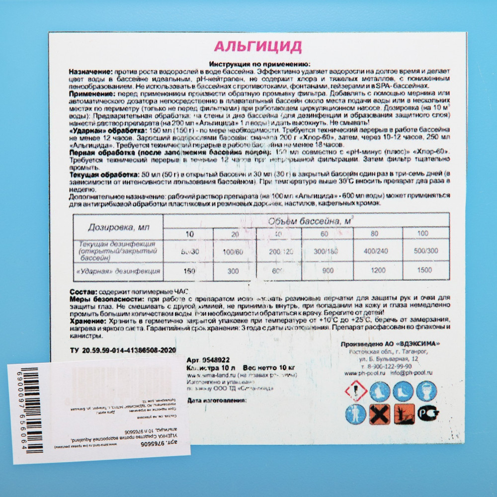 Ударная обработка: 150 мл — по мере необходимости. Требуется технический перерыв в работе бассейна не менее 12 часов. Заросший водорослями бассейн: сначала 200 г средства «Хлор-60», через 10–12 часов — 250 мл альгицида. Требуется технический перерыв в работе бассейна не менее 18 часов.
