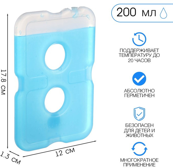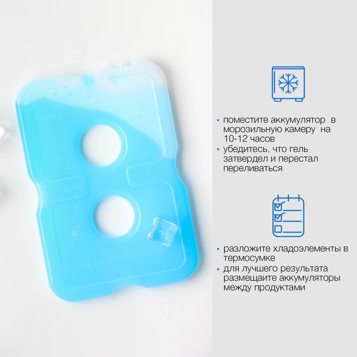 Аккумулятор холода — это герметичный контейнер с теплоёмким гелевым раствором. Аккумулятор холода предназначен для поддержания низкой температуры в контейнерах из вспененных материалов, сумках-холодильниках и термопакетах. Он равномерно распределяет холод внутри термосумки, не протекает, обеспечивает долговременное охлаждение продуктов. Положите резервуар в морозильную камеру до полного затвердевания (рекомендуется на 10–12 часов). Там изделие запасётся необходимым количеством холода, которое затем передаётся продуктам. После использования ополосните контейнер водой и протрите насухо. Храните изделие в морозильной камере или в другом сухом месте. Изготовлено из безвредных материалов. Предназначено для многократного использования (при условии сохранения непроницаемости корпуса). Подходит для любого вида продуктов. Срок эксплуатации не ограничен (при условии, что герметичность оболочки не нарушена).