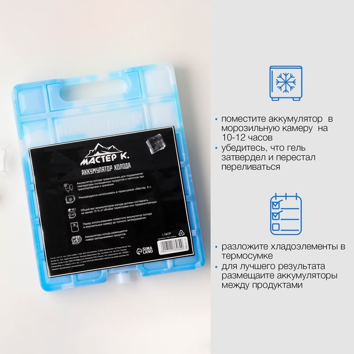 Аккумулятор холода — это герметичный контейнер с теплоёмким гелевым раствором. Аккумулятор холода предназначен для поддержания низкой температуры в контейнерах из вспененных материалов, сумках-холодильниках и термопакетах. Он равномерно распределяет холод внутри термосумки, не протекает, обеспечивает долговременное охлаждение продуктов. Положите резервуар в морозильную камеру до полного затвердевания (рекомендуется на 10–12 часов). Там изделие запасётся необходимым количеством холода, которое затем передаётся продуктам. После использования ополосните контейнер водой и протрите насухо. Храните изделие в морозильной камере или в другом сухом месте. Изготовлено из безвредных материалов. Предназначено для многократного использования (при условии сохранения непроницаемости корпуса). Подходит для любого вида продуктов. Срок эксплуатации не ограничен (при условии, что герметичность оболочки не нарушена).