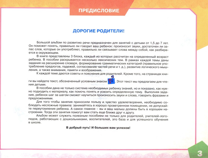 отличный альбом, замечательная книга! несколько разделов для разных возрастов(развитие речи малыша,развитие речи младшего дошкольника,развитие речи старшего дошкольника).Она у нас самая первая и самая любимая,потому уже такая трепаная-перетрепанная))))Советую всем брать,не пожалеете!