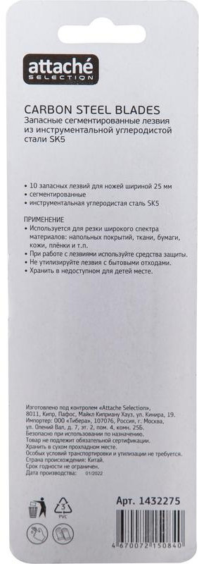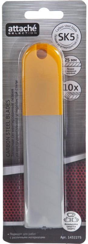 💳 Оплатить за товар можно при получении 🇰🇿 Есть бесплатная доставка по Казахстану от 1 дня 🎁 Копите бонусы с каждой покупки Набор запасных сегментированных отламывающихся лезвий Attache Selection. Используются для резки широкого спектра материалов: напольных покрытий, ткани, бумаги, кожи, пленки и т. п. Подходят для ножей шириной 25,0 мм. Лезвия изготовлены с технологией лазерной заточки, позволяющей создавать ровную и прочную режущую кромку. В комплекте 10 шт. |