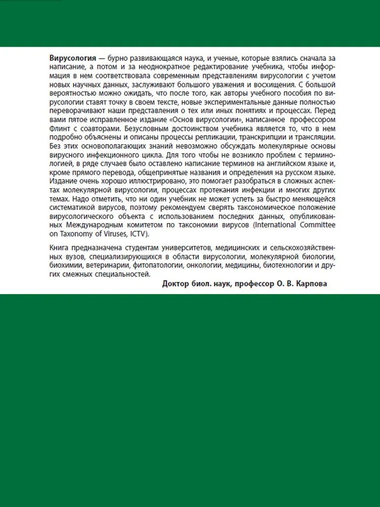Основы вирусологии. Комплект из 2 книгДж. Флинт, В. Р. Раканьелло, Т. Хациоанну В данный момент этот товар отсутствует в продаже. Возможно, у нас найдется аналогичный или похожий товар здесь. Ведущий в мире учебник по вирусологии представляет собой чрезвычайно ценное и высокоинформативное изложение вирусологии. В нем освещаются общие принципы и процессы, характерные для всех вирусов: репродукция, распространение внутри организма и в популяции, патогенез. Стратегии и механизмы описаны в первую очередь на примере вирусов животных, а также растений и бактерий. Читатель получит комплексное представление о биологии этих инфекционных агентов. Безусловным достоинством учебника является то, что в нем подробно объяснены и описаны процессы репликации, транскрипции и трансляции. Без этих основополагающих знаний невозможно обсуждать молекулярные основы вирусного инфекционного цикла. |
