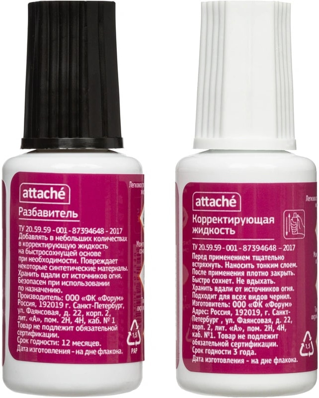 Attache Набор корректирующийВ данный момент этот товар отсутствует в продаже. Возможно, у нас найдется аналогичный или похожий товар здесь. Применяется для корректировки всех типов документов, включая бумагу для факсов. Подходит для исправления всех видов чернил. Ложится ровным гладким слоем, создает непрозрачное покрытие. Имеется шарик. |