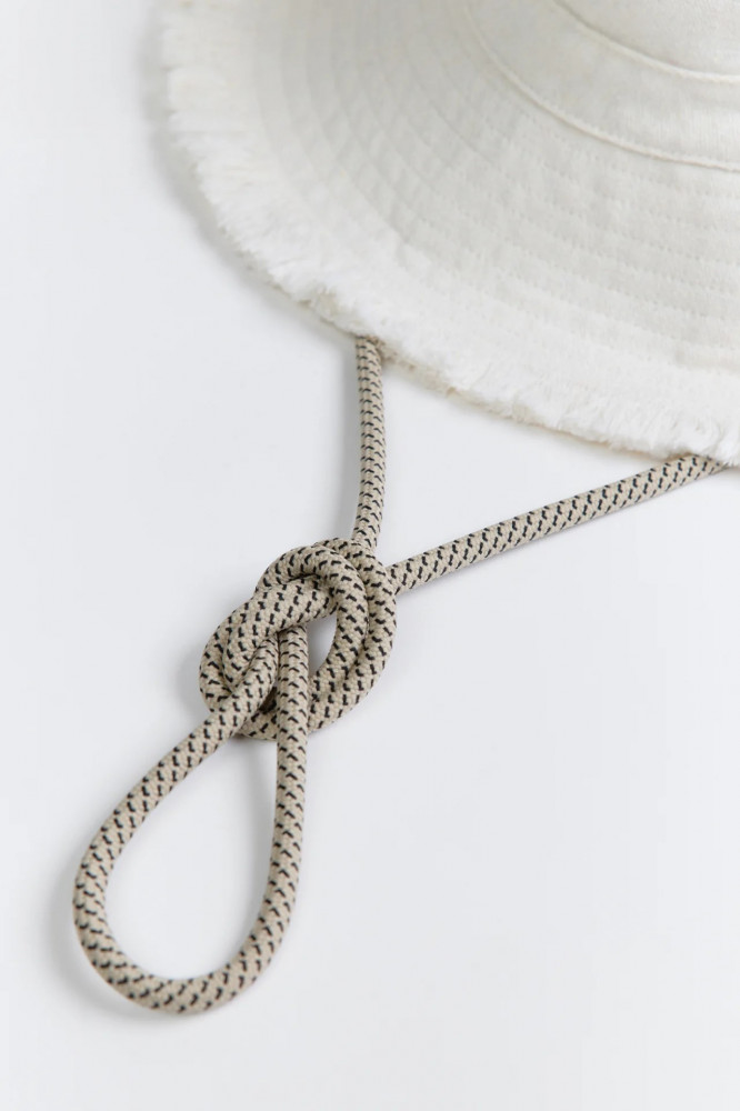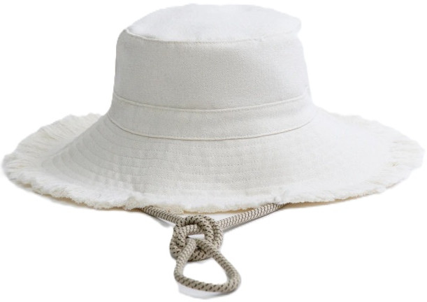 Женская панама выполнена из лёгкой и дышащей 100% хлопковой ткани с гладкой текстильной фактурой. Модель оснащена широкими простроченными полями и обрезанными краями с короткой бахромой. Для комфортной посадки предусмотрена регулировка обхвата головы на кулиске и съёмный шнурок из корда.
