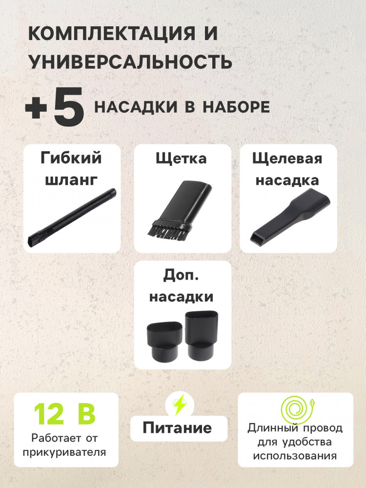 💳 Оплатить за товар можно при получении 🇰🇿 Есть бесплатная доставка по Казахстану от 1 дня 🎁 Копите бонусы с каждой покупки Серия: Чистый салон Автомобильный пылесос Cartage с 5 насадками — это мощный и универсальный инструмент для поддержания чистоты в вашем автомобиле. Он оснащен мощным двигателем, который обеспечивает высокую мощность всасывания, позволяя быстро и эффективно удалять пыль, грязь и мусор. В комплекте с пылесосом идут 5 различных насадок, которые позволяют очищать различные поверхности автомобиля, включая труднодоступные места. Пылесос имеет компактный размер и легкий вес, что делает его удобным для хранения в автомобиле и использования в любое время. |