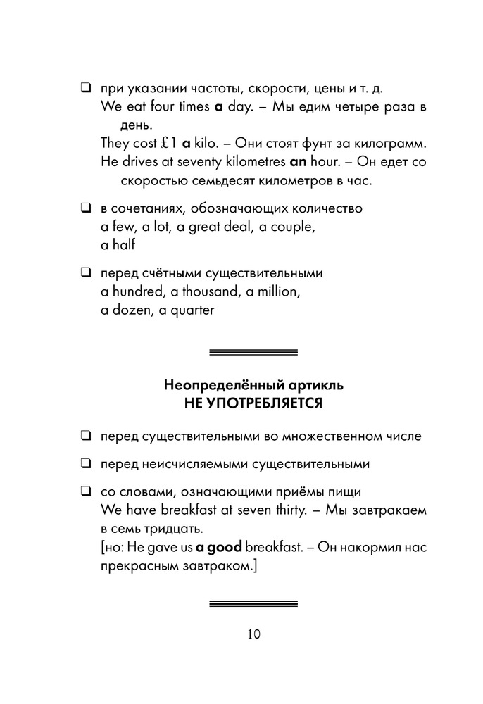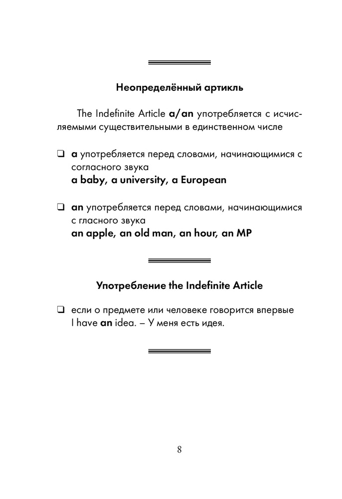 Неплохая книга - за смешные деньги. Кто изучает английский язык - обязательно купите. Своих денег книга точно стоит, а из конкретики - порадовало, что автор зачастую просто компилировал учебник по грамматике. Это гораздо лучше, чем размышлизмы о языке, как у других авторов. Покупайте - не пожалеете, книга обязательно пригодится!