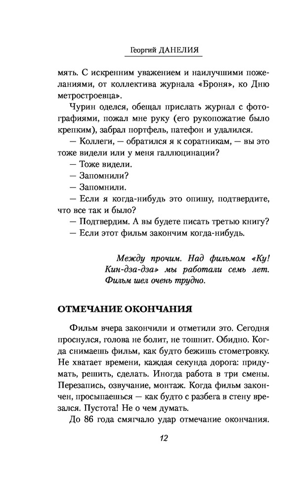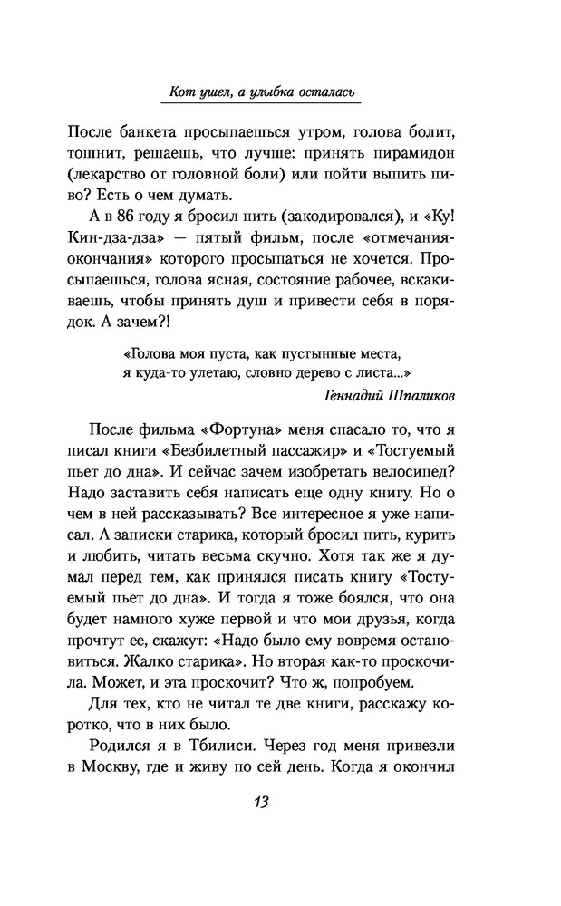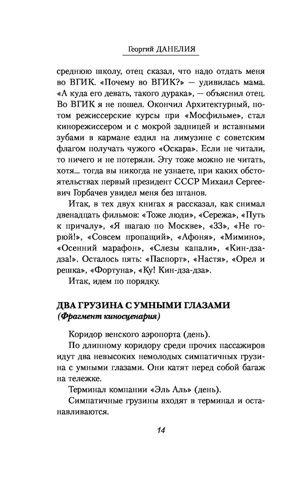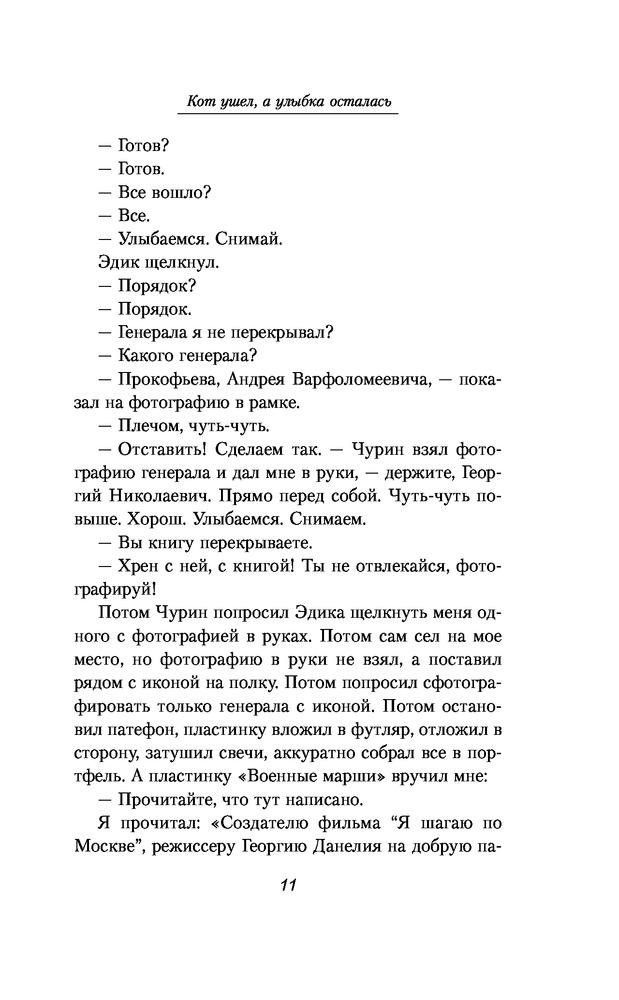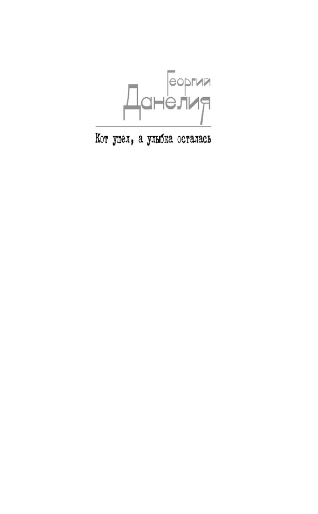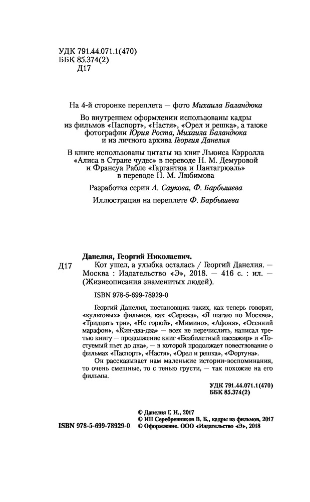 Кот ушел, а улыбка осталасьВ данный момент этот товар отсутствует в продаже. Возможно, у нас найдется аналогичный или похожий товар здесь. Серия: Жизнеописания знаменитых людей Георгий Данелия, постановщик таких, как теперь говорят, «культовых» фильмов, как «Сережа», «Я шагаю по Москве», «Тридцать три», «Не горюй», «Мимино», «Афоня», «Осенний марафон», «Кин-дза-дза» — всех не перечислить, — написал третью книгу — продолжение книг «Безбилетный пассажир» и «Тостующий пьет до дна» — в которой продолжает повествование о фильмах «Паспорт», «Настя», «Орел и решка», "Фортуна". |