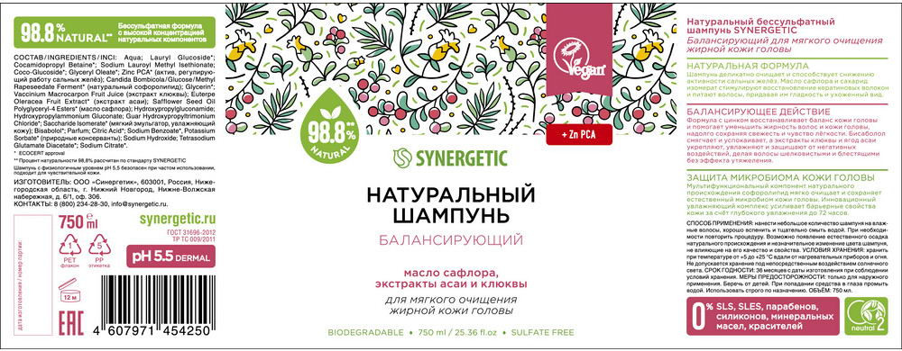 Synergetic Шампунь бессульфатный для жирной кожи головы «Балансирующий»
