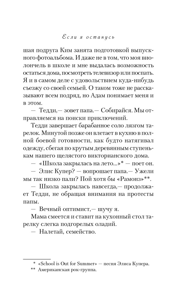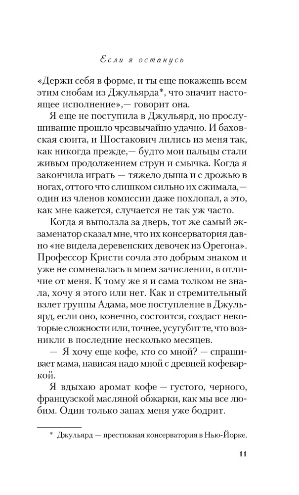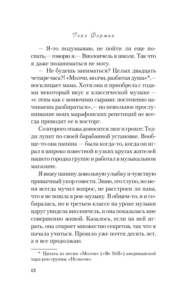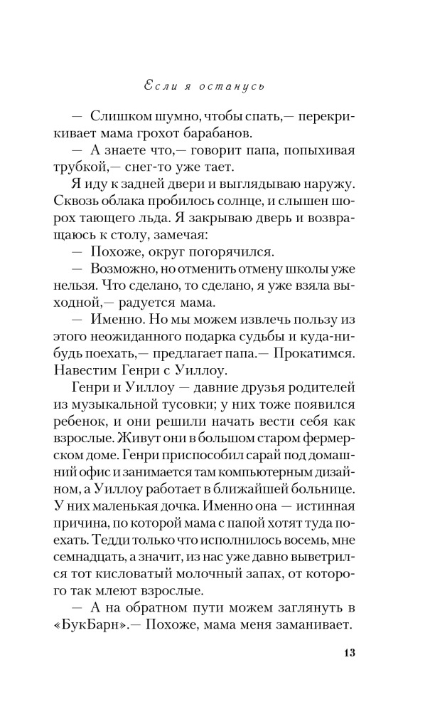 Если я останусьВ данный момент этот товар отсутствует в продаже. Возможно, у нас найдется аналогичный или похожий товар здесь. Серия: Pocket Book (обложка) Эту книгу сравнивают с романом Элис Сиболд «Милые кости», самым поразительным бестселлером начала XXI века, по единодушному мнению критики. Хотя общая у них только канва: и здесь, и там душа юной девушки, расставшись с телом, наблюдает со стороны за жизнью близких людей. Но в случае с героиней книги Гейл Форман, семнадцатилетней Мией, дело обстоит много сложнее. Судьба поставила ее перед выбором — или вернуться к жизни, или навсегда уйти в мир иной, последовав за самыми любимыми для нее людьми. |