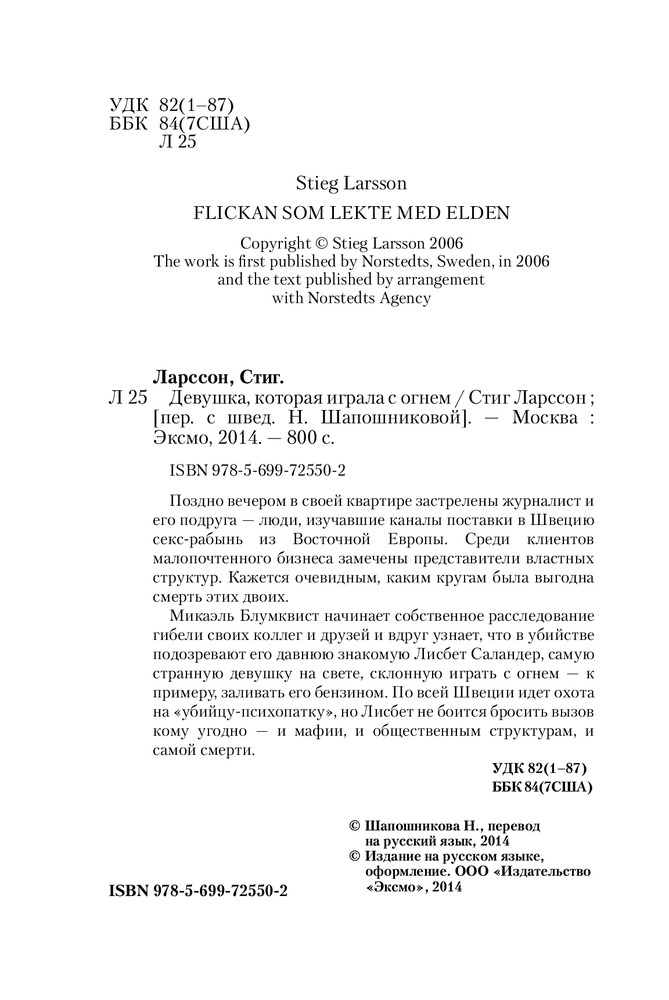В данный момент этот товар отсутствует в продаже. Возможно, у нас найдется аналогичный или похожий товар здесь. Серия: Millennium Pocket Поздно вечером в своей квартире застрелены журналист и его подруга — люди, изучавшие каналы поставки в Швецию секс-рабынь из Восточной Европы. Среди клиентов малопочтенного бизнеса замечены представители властных структур. Кажется очевидным, каким кругам была выгодна смерть этих двоих.