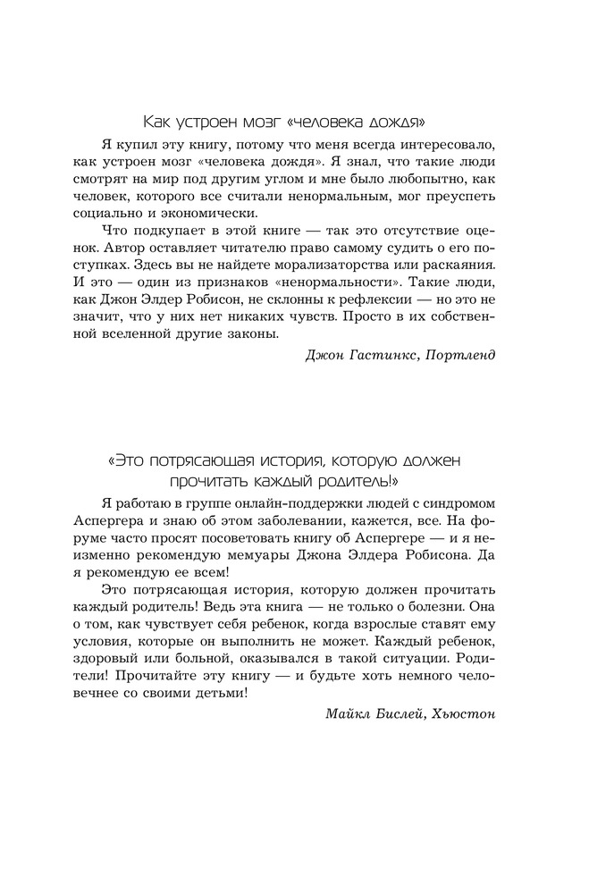 | Джон Элдер Робисон — аспергерианец, который успешно живет в нормальном обществе. Его детство пришлось на 1960-е гг., когда диагноз "синдром Аспергера" еще не существовал и детям-аутистам не помогали интегрироваться в общество и не умели оказывать психологическую помощь. |
