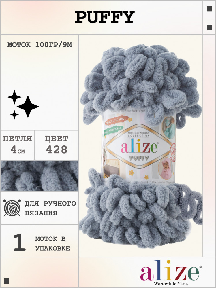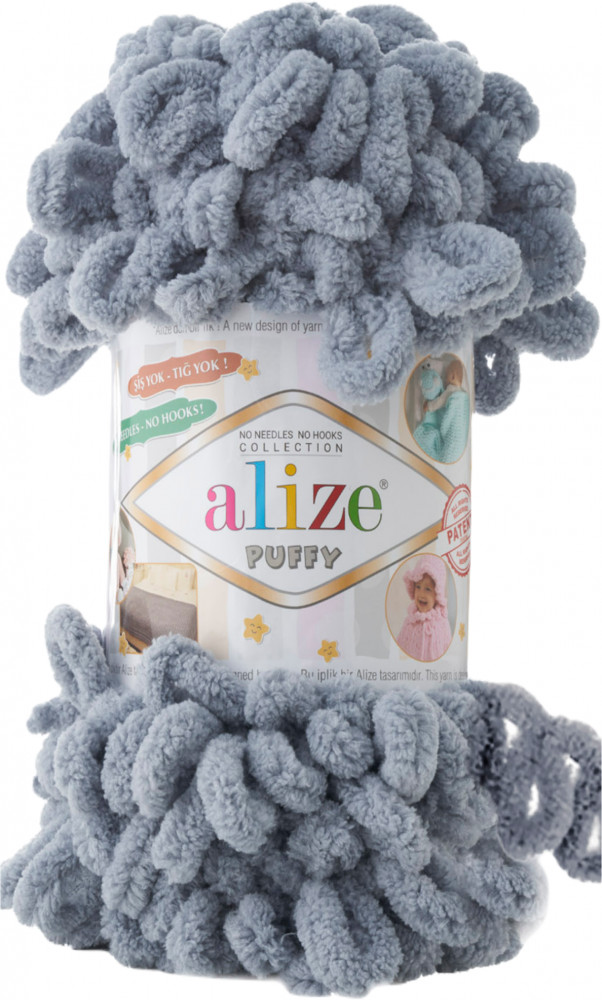 Alize Puffy — турецкая фантазийная пряжа для ручного вязания, сочетающая в себе нежную текстуру и готовые петельки для вязки руками. Подходит для одежды и аксессуаров. Нить плюшевая, толстая, пушистая, объемная и крепкая. Очень мягкая и приятная на ощупь, не вызывает раздражения и является гипоаллергенной. Ее можно распутывать и она не истончиться. Имеет очень богатую палитру цветов и оттенков.