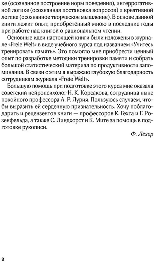 💳 Оплатить за товар можно при получении 🇰🇿 Есть бесплатная доставка по Казахстану от 1 дня 🎁 Копите бонусы с каждой покупки Случалось ли вам забыть важную дату, заблудиться в знакомой местности, перепутать лицо или имя человека? Наша память — это уникальный инструмент человеческой психики, который тем не менее нуждается в постоянной тренировке и развитии. Книга известного учёного Франца Лёзера знакомит читателей с функциями и способами рационального использования и совершенствования памяти. Универсальный метод скреплённых опор и ассоциаций поможет запомнить самые длинные и сложные тексты, а благодаря нехитрым приёмам вы сможете быстрее, прочнее и точнее ориентироваться в именах и различать лица. Теоретический материал автор сопровождает разнообразными тестами и упражнениями на восприятие, концентрацию, запечатление, повторение и т.п. Книга будет полезна каждому, кто стремится укрепить память, развить когнитивные способности и повысить уровень качества своей жизни. |